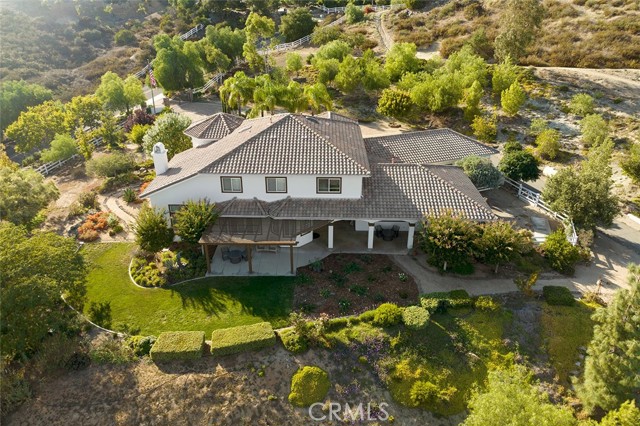 This dramatic custom La Cresta Estate with city lights & mountain views, sits in a highly sought-after central location and has all the bells & whistles! The grand entrance through a stone & wrought iron security gate gives you a taste of the quality & luxury to come, as you drive over the expansive interlocking paver circular driveway, past mature trees & charming rose garden, through the porta cochere, to the stately home. With a generous primary bedroom with ensuite bathroom on the main floor, most of your living is on one level, offering ease of living, very few steps, and exciting views from every window, which include nearby vineyards, city-lights & distant mountains. The kitchen opens to a massive great room with soaring ceilings, a sunny breakfast nook, and a formal dining room, creating a wonderfully open feeling & flow. Also on this level is an extra-large office, laundry room, powder room, and foyer with ceilings that reach to the second floor. The curved staircase offers another moment of drama, as it sweeps upstairs to a secondary primary suite, two additional bedrooms, another bathroom & a huge bonus room loaded with windows. Outside, abundant shade is offered by covered patios, which provide views past a grassy lawn (plenty of room for a pool) to the manicured grounds and beyond to the entire valley. The driveway continues past the house to a large BREEZEWAY BARN, which is currently set up with three in & out stalls, tack room, workshop area and apartment with bedroom, bathroom, and kitchen/living area. Your head will be on a swivel, as you enjoy this stunning fully fenced property with something magical to experience in every direction – sitting areas, fruit trees, walk-paths and delightful surprises, like the covered viewing platform, from where you can see the entire Temecula Valley & beyond. On the path to the platform, you will see the Solar, which is paid-for! This fantastic La Cresta estate has been lived in by only one family, who built it. It has been meticulously maintained and the love really shows! ***Santa Rosa Plateau: 5-acre minimum parcels, star-filled skies & peace – just minutes to schools, restaurants, hospitals, grocery stores, 5 Fwy & the famous Temecula Wine Country. Enjoy community activities & miles of trails via the private trail system & 1000s of acres of Ecological Reserve…All less than 1.5 hours from LA, SD, OC, Palm Springs & Big Bear. Discover the country, yet convenient, lifestyle of La Cresta & Tenaja!
