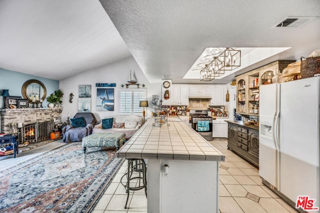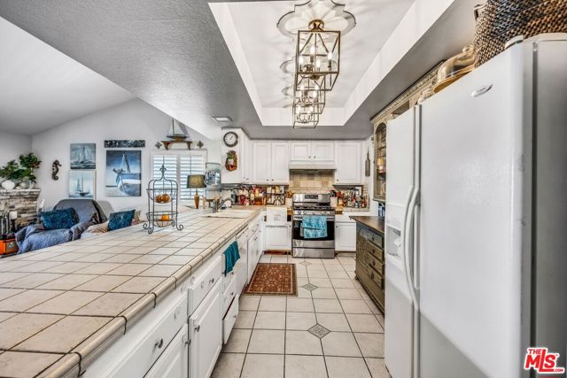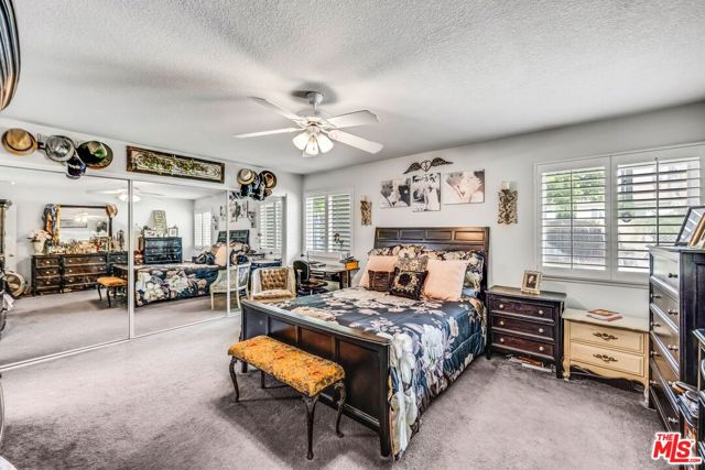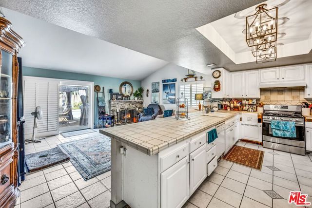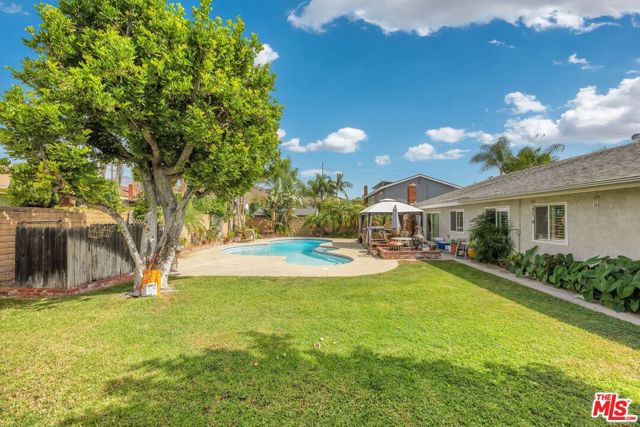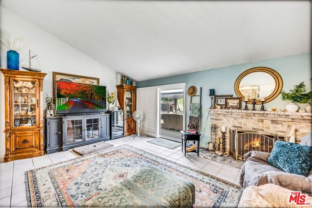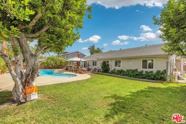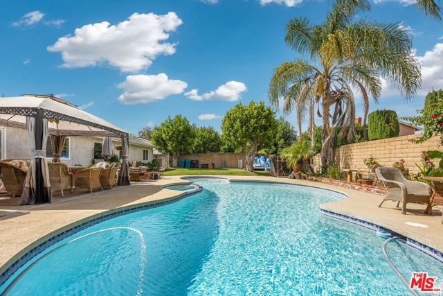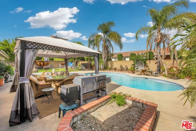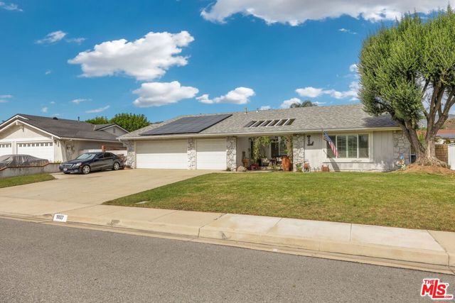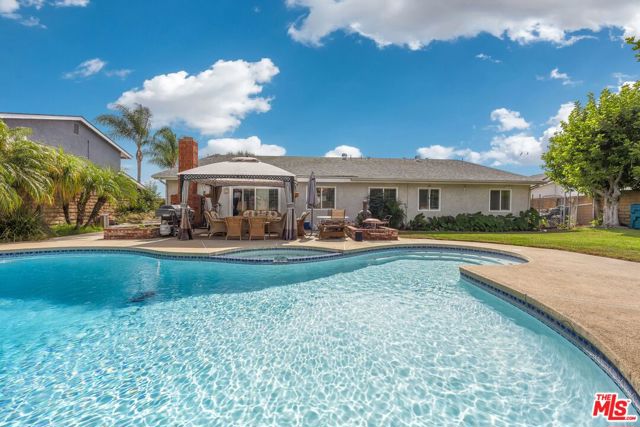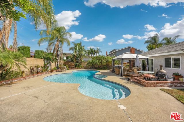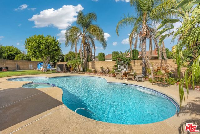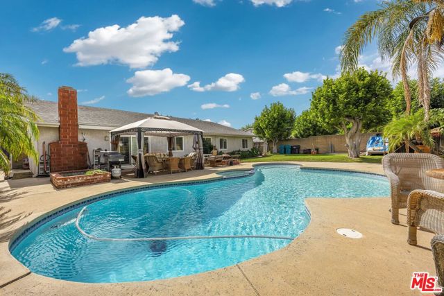 This lovely residence showcases living room with vaulted ceiling and dining area. Open concept kitchen with tray ceiling, breakfast bar and the spacious family room with fireplace and high ceiling that opens the rear yard. The open layout makes it perfect for entertaining, allowing a seamless flow between the sitting, dining and kitchen. Down the hallway, you will find 3 spacious bedrooms, a full bath, a master bedroom with walk-in closet, full bath and double sink vanity. Warmth and natural light abound throughout the floor plan. There is also an office space located through the laundry area. Fabulous entertainer’s backyard with sparking pool, patio area, lush plantings and mountain view. Central a/c, window shutters throughout, 2-car garage and a solar panel that can keep your electricity bill lower.