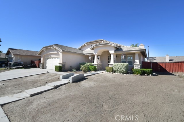 Welcome Home to this adorable single-story gem! Great curb appeal with beautiful stacked stone entry and front porch. 3 bedrooms and 2 bathrooms and an office/den/possible 4th bedroom. Desirable East Hemet location. Large lot and spacious backyard. RV parking with a 50-foot-long pad. Open light and bright floorplan. Walk-in closet. Kitchen open to the family room with fireplace. Laminate flooring throughout and carpet in the bedrooms. Alumawood patio cover. Come see this home today!