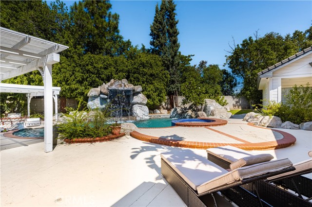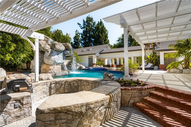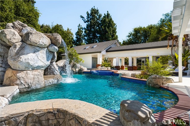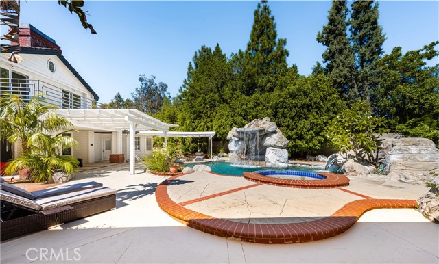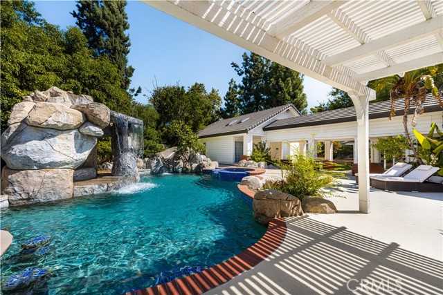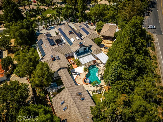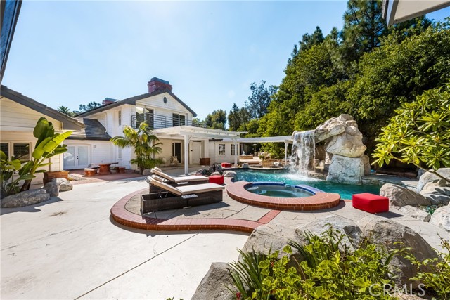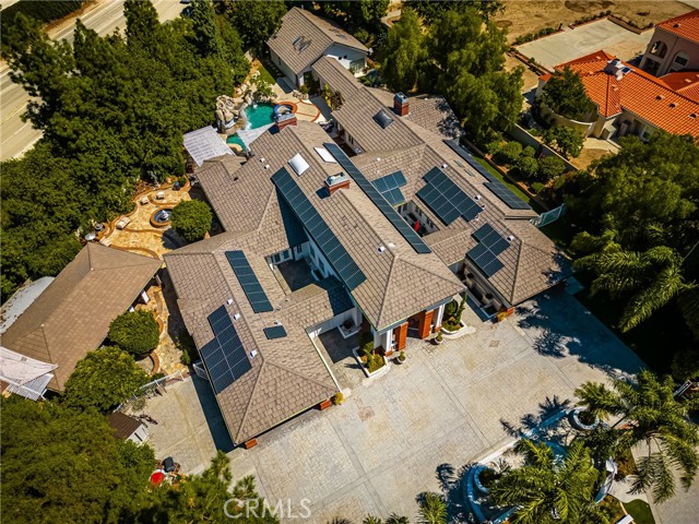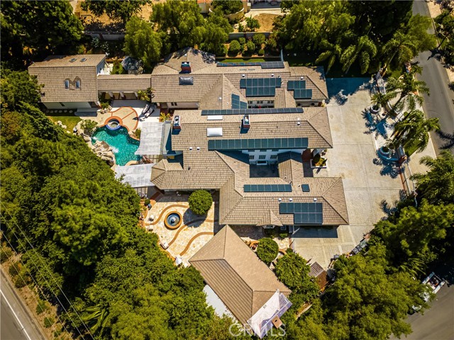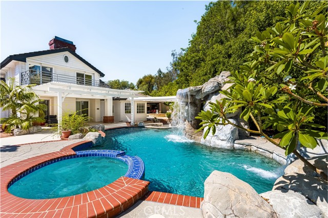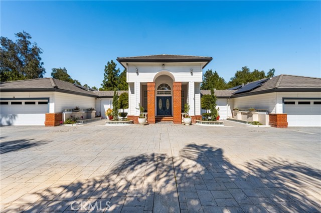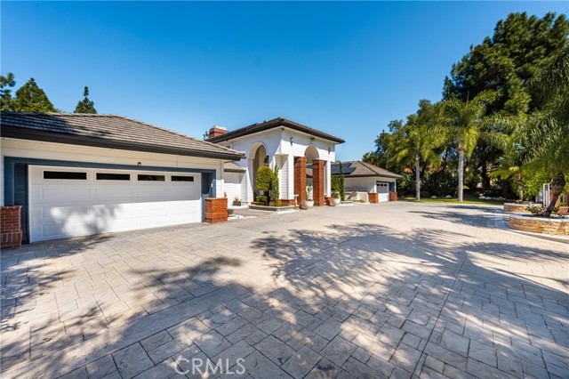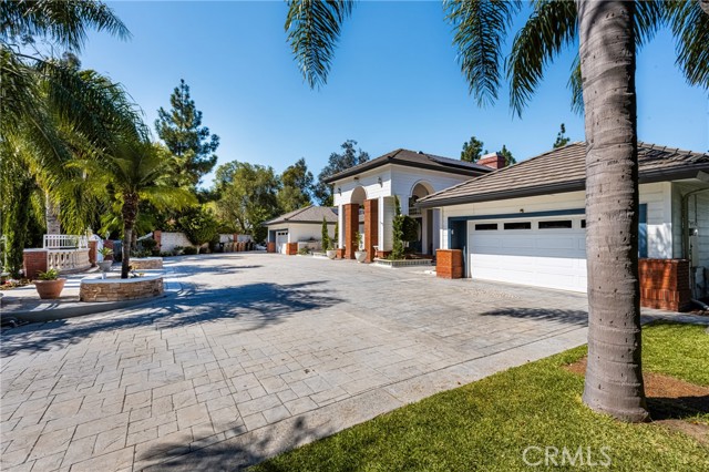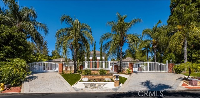 Incredible opportunity to live in a custom, single-story home in the desirable Peralta Hills neighborhood. The gated estate features a large circular driveway, four-car garage, energy-efficient solar system, two master suites, and detached, two-bedroom guest house situated on an acre. Inside, natural light pours into the living room with soaring ceilings. Dual sliders open to the peaceful courtyards. The gourmet kitchen has been fully-remodeled with high-end appliances and a dining nook for family gatherings. Experience ultimate comfort in the first primary suite with a private patio, dual vanities, and a separate tub and shower. Unwind in the second primary suite with high ceilings, dual vanities, a soaking tub, and a separate shower. A floating staircase leads to a bonus room, ideal for an office or game room with built-ins, a fireplace, and a balcony with great views. Guests will enjoy the privacy of the 1,000 square foot detached guest house with two bedrooms, a bathroom, full kitchen, its own private entrance, and its own yard. Entertain family and friends on the resort-like grounds, with an inviting pool, spa, and waterfall, and enjoy entertaining outdoors in the large covered area with built-in bar, BBQ, ceiling fans, and fireplaces. Don’t miss the opportunity to own this private oasis.