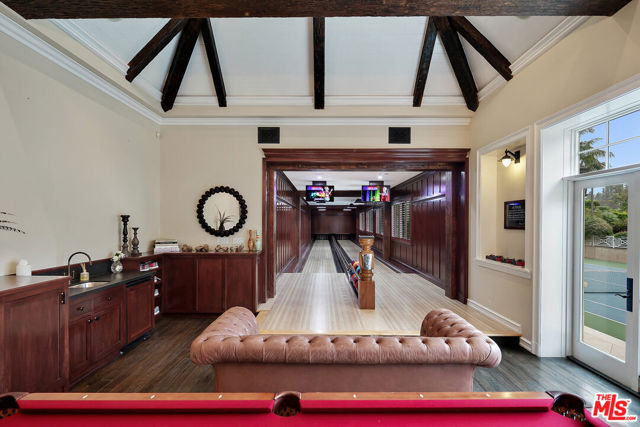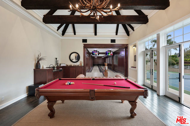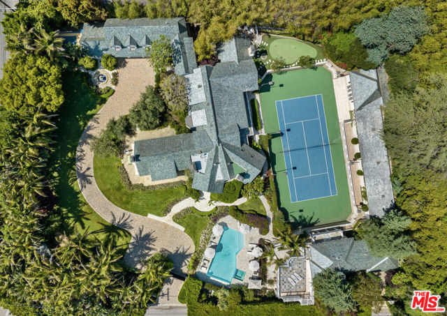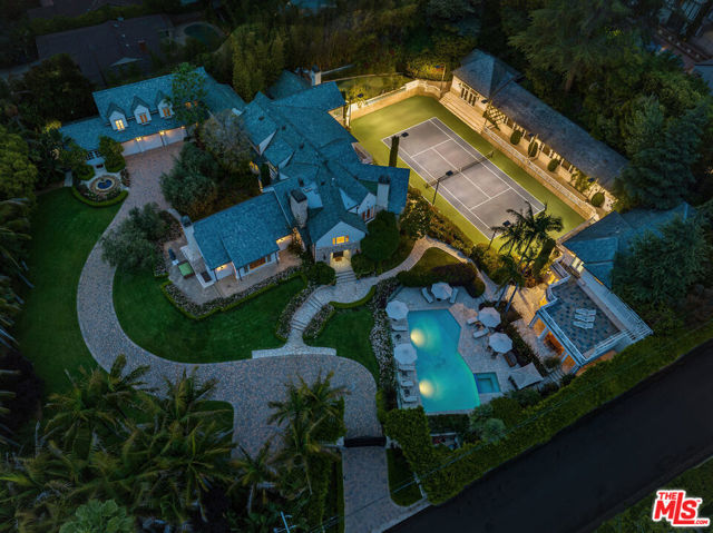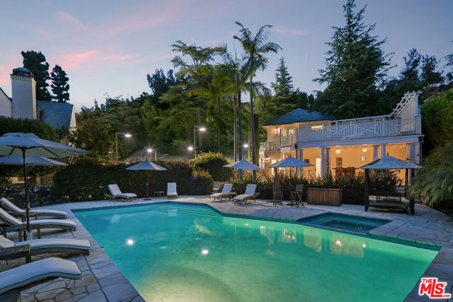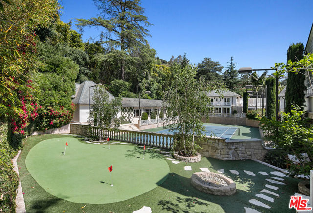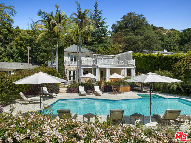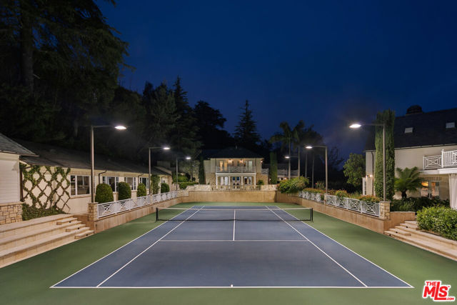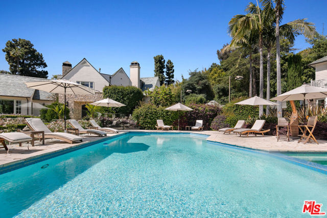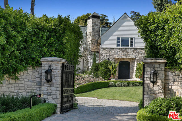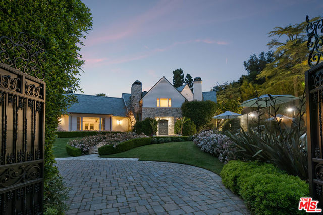 Explore an exclusive gated estate originally designed by Paul Williams in 1941 for Bert Lahr, the famed lion in “The Wizard of Oz.” This private haven, owned by luminaries like Betty Grable, Harry James, and Paul McCartney, has been beautifully remodeled to evoke the elegance of a Connecticut/Hamptons residence. With luxurious features, including two master suites, three secondary bedrooms, seven bathrooms, and extensive entertainment amenities like a pool, spa, tennis court, and bowling alley, this extraordinary property offers a coveted lifestyle on over 1.38 acres of land. The main house features two lavish master suites, three secondary bedrooms, two staff quarters, and a total of seven bathrooms. A grand living area with high-vaulted ceilings, a media room with a wet bar and wine cellar, create an ideal setting for entertainment. Outside, enjoy extensive amenities such as terraces, an outdoor kitchen, pool, spa, tennis court, koi pond, sports court, putting green, and a vintage-inspired two-lane bowling alley.A separate guest house with private entrance offers two bedrooms, two and a half bathrooms.