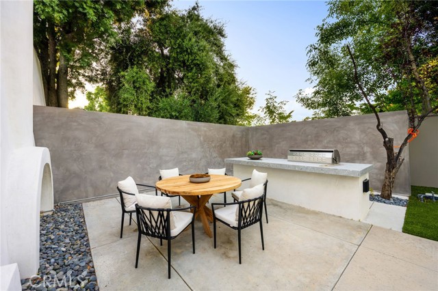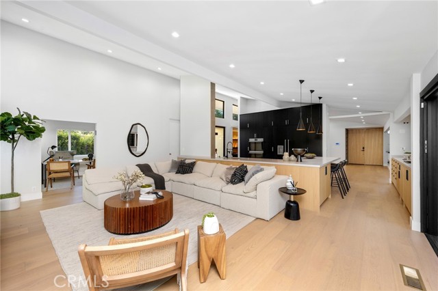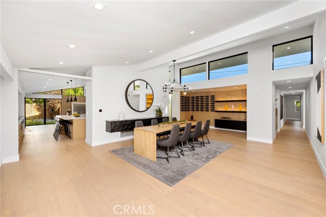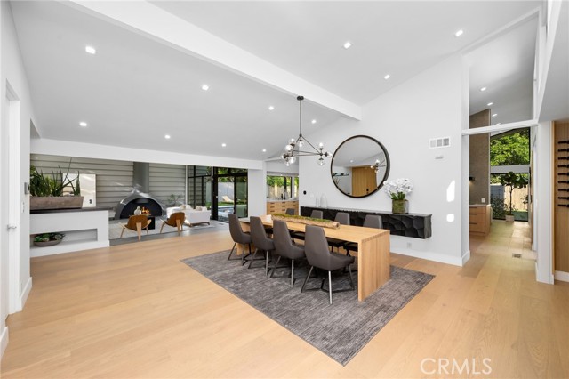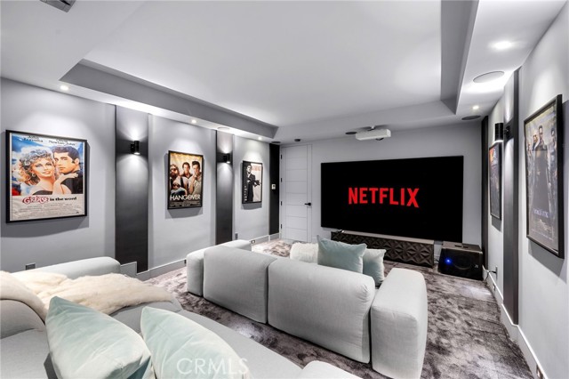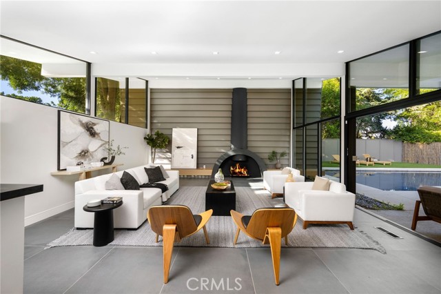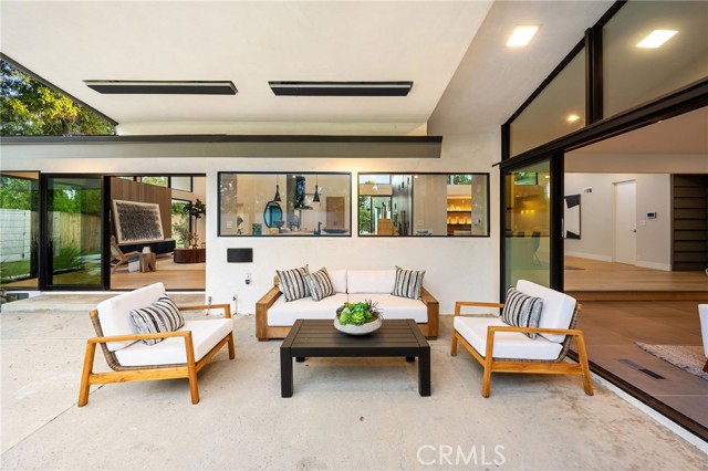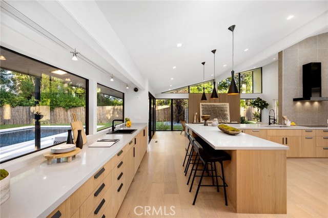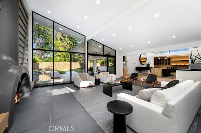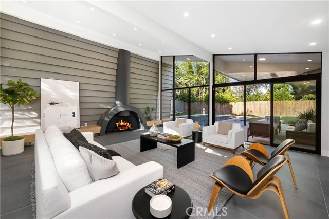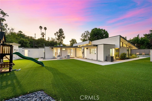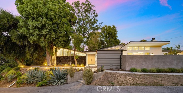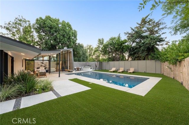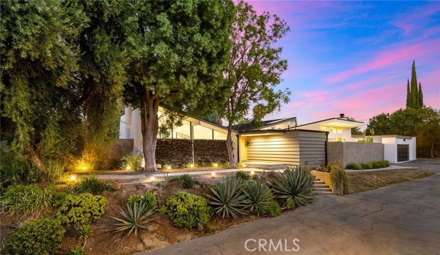 Stunning mid-century modern home in a prominent enclave of Tarzana. Inviting curb appeal with gated entrance welcomes guests through an covered entrance to open floor plan with beautiful finishes throughout. Meticulously remodeled, the property has spacious common areas with pitched ceilings, geometric windows and wood and tile floors. A large living room showcases a stunning fireplace and floor-to-ceiling glass doors and windows that open to an entertainer’s backyard. A Gourmet Chef’s kitchen comes with beautiful stone counters, stainless steel appliances, and a large breakfast bar adjacent to the spacious family room and dedicated office. The exquisite primary features access to a private exterior jacuzzi, walk-in closet, and spa-like master bath with soaking tub, open glass shower, and dual vanity. A state of the art movie theater and guest rooms complete the main sleeping quarters perfect for family and friends. A private entertainer’s yard has a sparkling pool and covered wood patio perfect for entertaining. The backyard also features tremendous amounts of side yards with extra entertainment areas, an exterior en-suite casita and detached pool house. Enjoy everything Tarzana has to offer, located near shops, restaurants, and more!