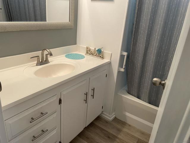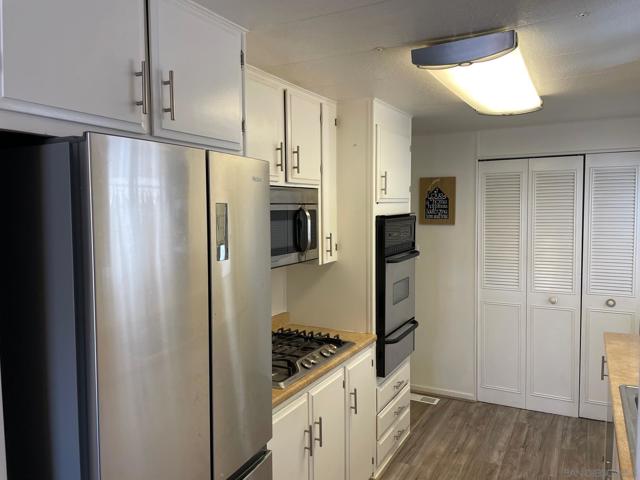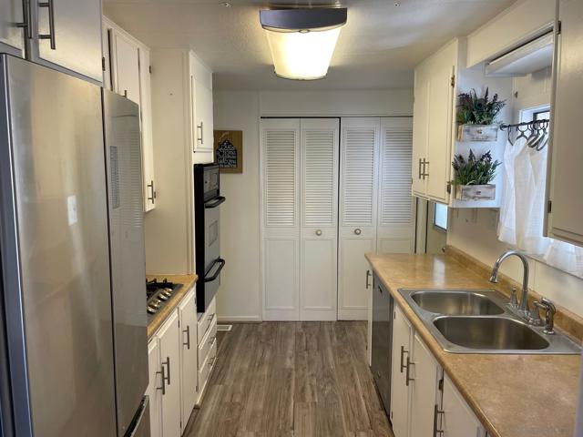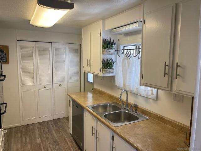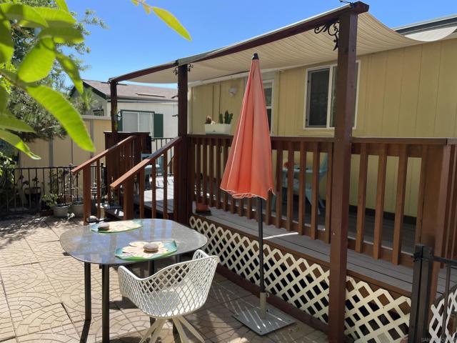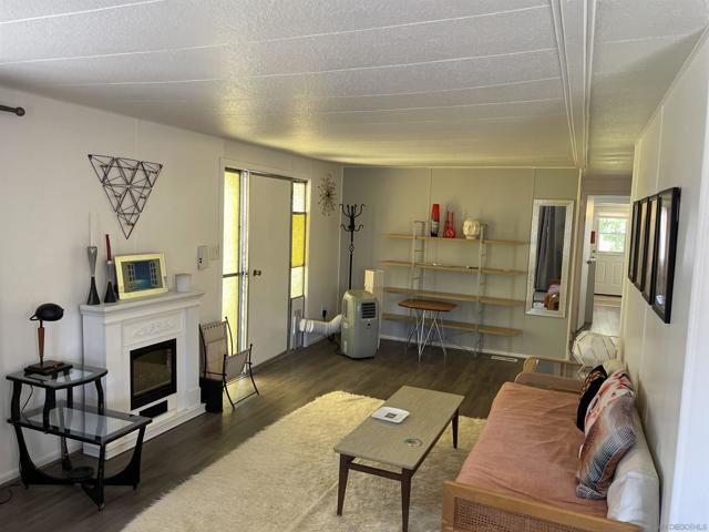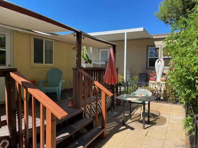 Great San Diego location in a beautiful Senior community! Spacious and remodeled, this home has been lovingly maintained. The home sits at the top of a hill and always enjoys a cool breeze. Medium oak vinyl plank flooring throughout, white with soft gray accent walls, nice size living room with an electric fireplace and some newer vinyl windows. The galley style kitchen includes the stainless steel appliances, ample storage and a utility closet that includes the washer and dryer. The front entrance has a security screen door and the side yard is covered. The private, fenced backyard is perfect for a dog and backs up to a green, lushly treed hill side to enjoy nature. Plus a nice raised, pressure treated deck with roll down sun shades. The large carport can park 3 cars and it has a storage shed. Best of all, No Property Tax, home is on annual registration!