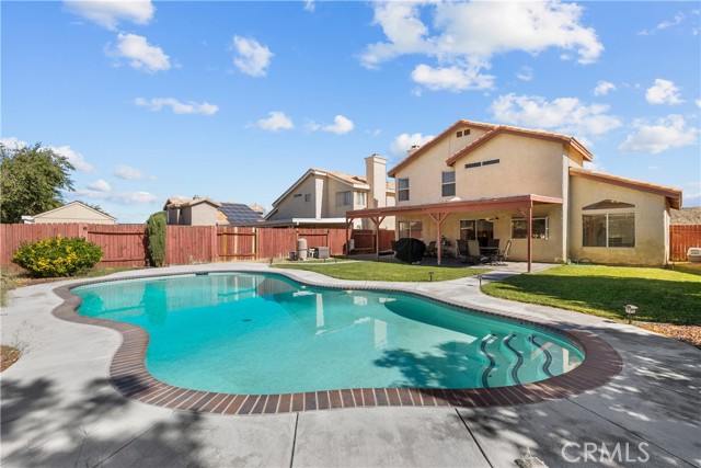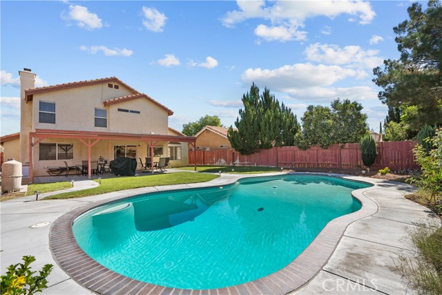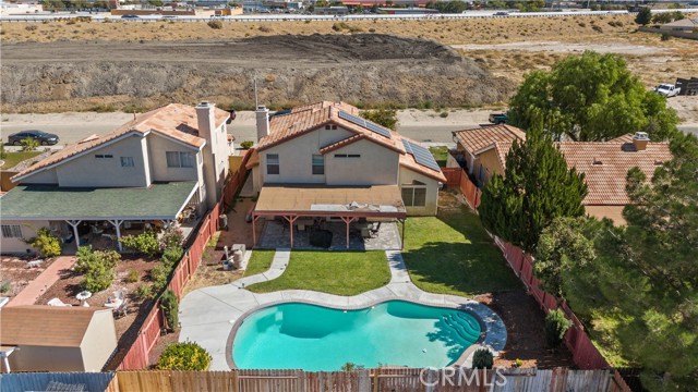 Solar Paid Off! Heated Pool! West Side of Lancaster! 4 bed 3 bath and a huge backyard patio to enjoy the great outdoors. This home welcome you with high vaulted ceilings, and very spacious living room, dining room area with plenty of natural light. Upstairs boost 3 bedrooms and 2 full bathrooms. The master suite has a walk-in closet, double vanity. There is a bedroom and full bathroom downstairs. The kitchen is opened space facing the family room which you can enjoy cooking and at the same time entertain your guest or family. The Backyard features a Large Pool and plenty of additional space and shade for entertainment. The Pool was recently renovated with new plaster along with recently done stone bricks underneath the large patio. This home is conveniently close to shopping centers, schools, freeways, and restaurants.
