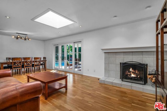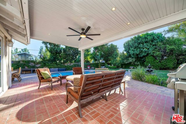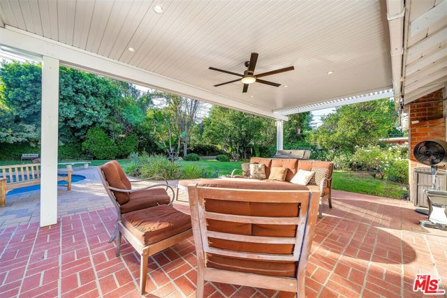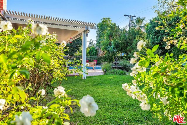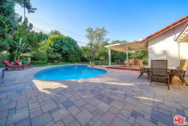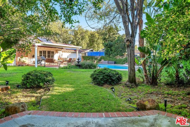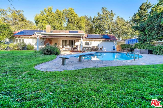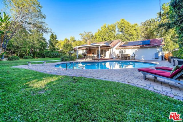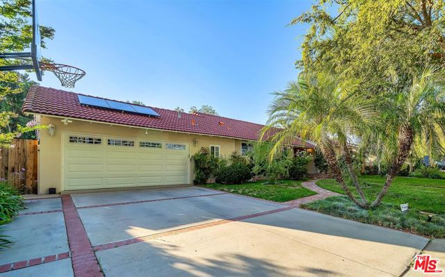 Charming pool home on stunning cul-de-sac in West Hills. Recent updates include: New HVAC system and ducting, whole attic insulation,200amp. Electrical panel, new garage door. Gorgeous salt-water pool with energy efficient pump and heater, beautiful pavers, large grassy area for play. App controlled, weather sensitive sprinklers. Tall trees and Boston ivy on perimeter walls give a comforting sense of tranquility and privacy. Solar panel with backup battery means no loss of power. Energy saving Tex-Cote Coolwall covers exterior walls, keeping wall cool even on the hottest summer days. Inside, the bright dining and living rooms have ecologically friendly bamboo flooring, a soaring skylight, wood burning fireplace, and French doors opening to the beautiful backyard. The kitchen has a new KitchenAid dishwasher, center island, granite counter tops, and a very large breakfast area. Down the hall are two spacious bedrooms, a full-sized bathroom, and primary bedroom with two closets, grand views of the backyard and an ensuite bathroom. Across the house, a guest powder room and bonus room (not included in the total square footage) – great as an office, playroom, game room, or whatever your needs may be. The direct access garage is lined with tall cabinets and a finished attic s pace with a pull-ladder – perfect, easy access to your stored items. A220V panel in the garage means you’re ready for an electric vehicle charging station or spa in the backyard.