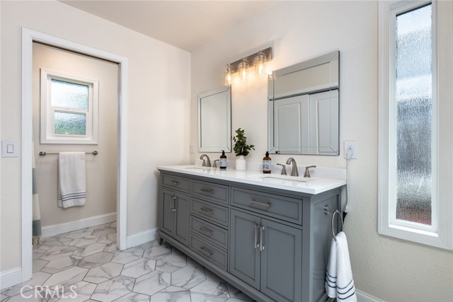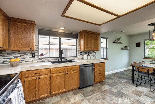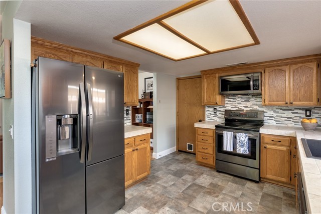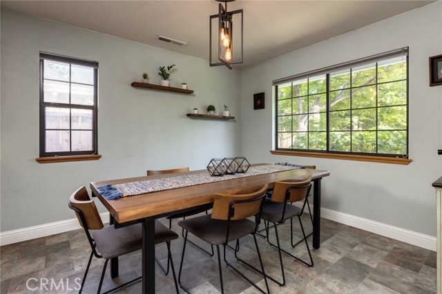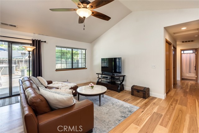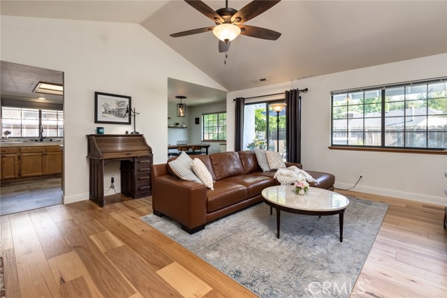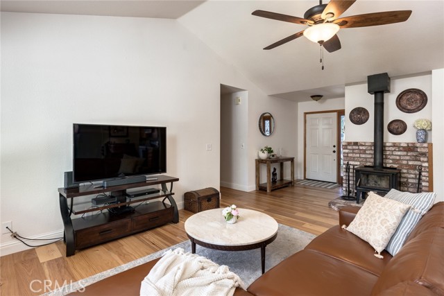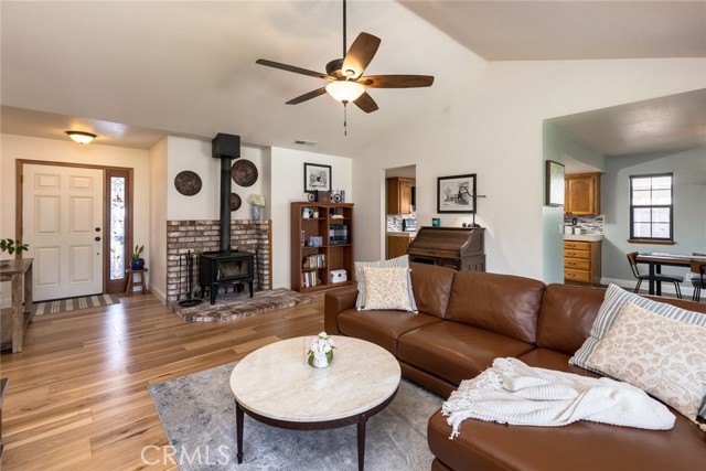 Welcome to your dream home! This meticulously remodeled residence boasts a perfect blend of modern comfort and timeless elegance. Step onto newer engineered hickory hardwood floors that grace the main living space, leading to the cozy master bedroom adorned with plush newer carpeting. The fully remodeled master bathroom is a sanctuary, featuring hexagon tile in soft hues, vanity drawers, and a touch of luxury. The open living space showcases an updated kitchen, complete with matching LG appliances, granite composite sink, and a wood-burning stove. Vaulted ceilings in the living room add a sense of grandeur, while the newer HVAC system ensures year-round comfort. The exterior is equally impressive, with recent paint, a front tree enclave, and a newer roof installed in 2016. Enjoy the expansive backyard adorned with fruit trees, including lemon and plum, surrounded by mature landscaping—your private oasis awaits!