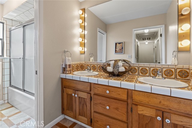 : Shower, Closet In Bathroom, Walk-in Shower, Shower In Tub, Double Sinks In Bath(s), Tile Counters, Main Floor Full Bath, Double Sinks In Primary Bath