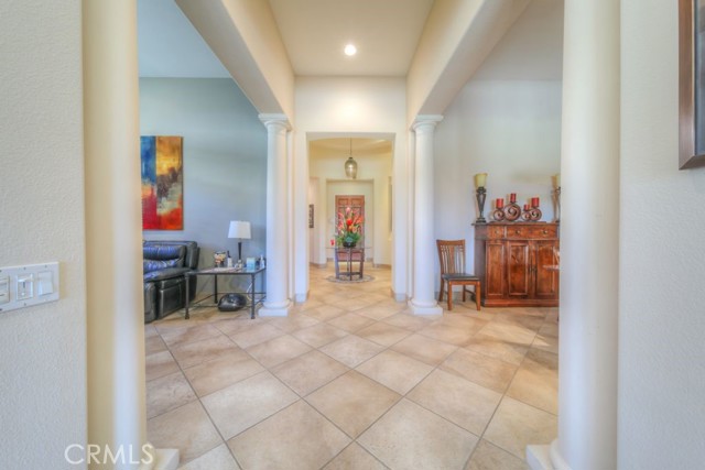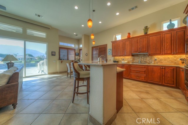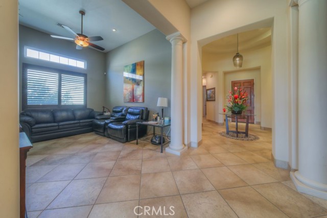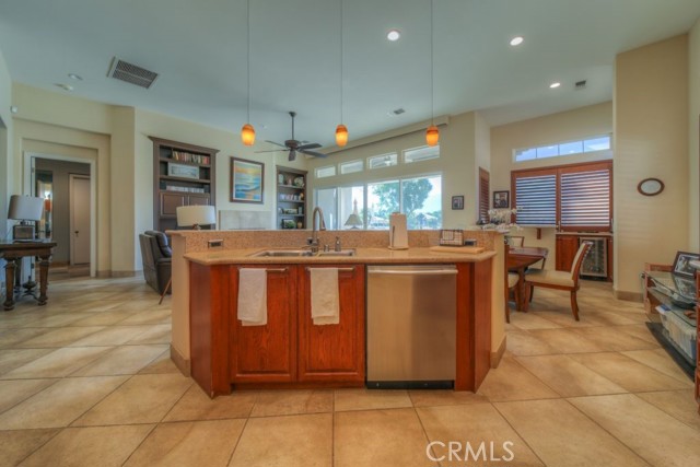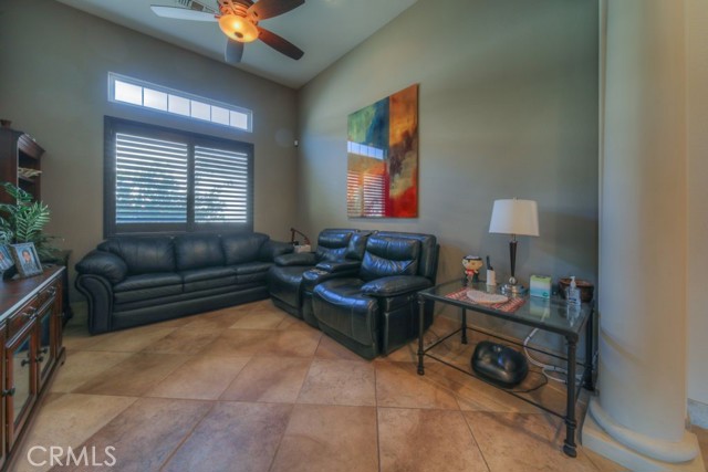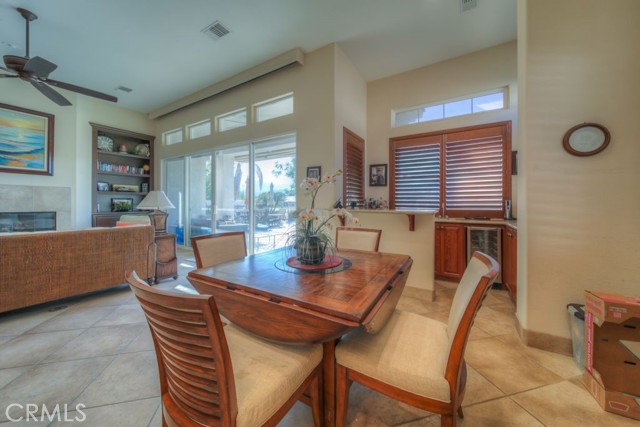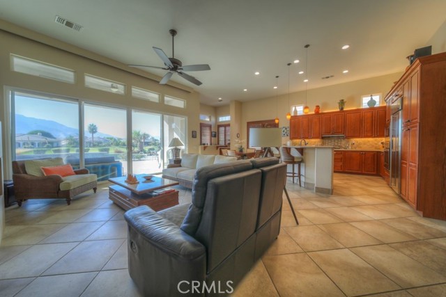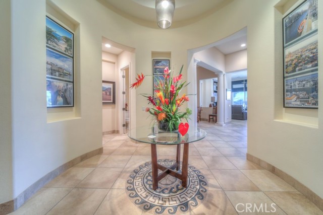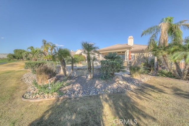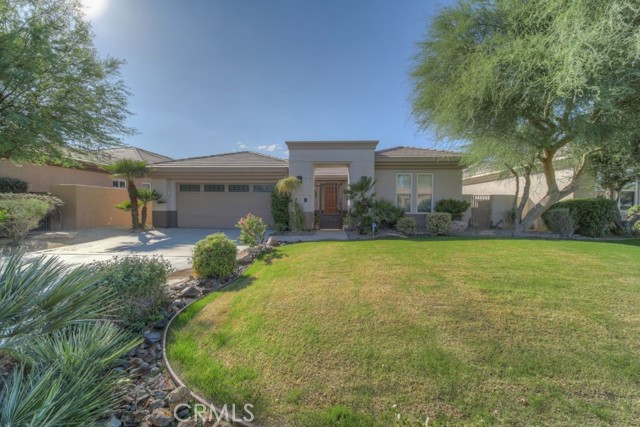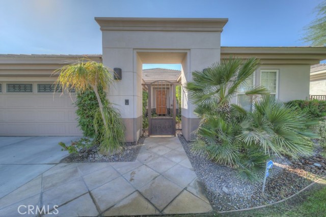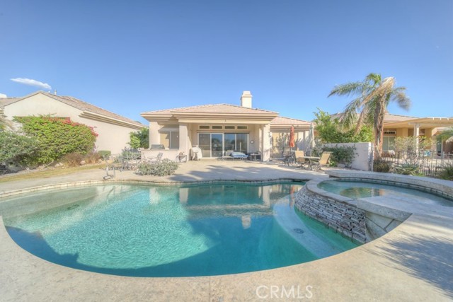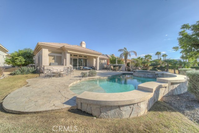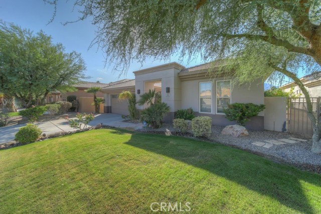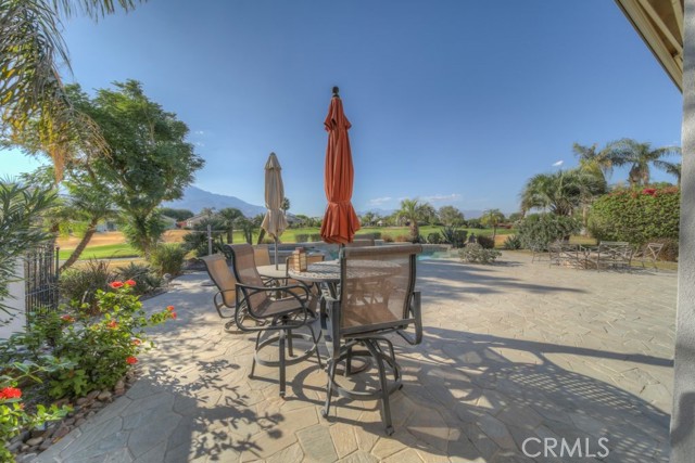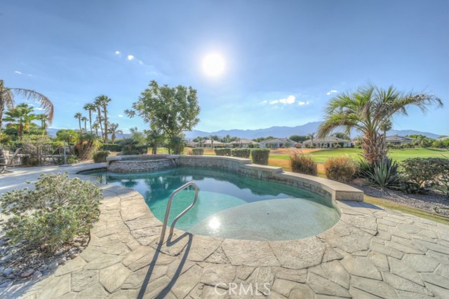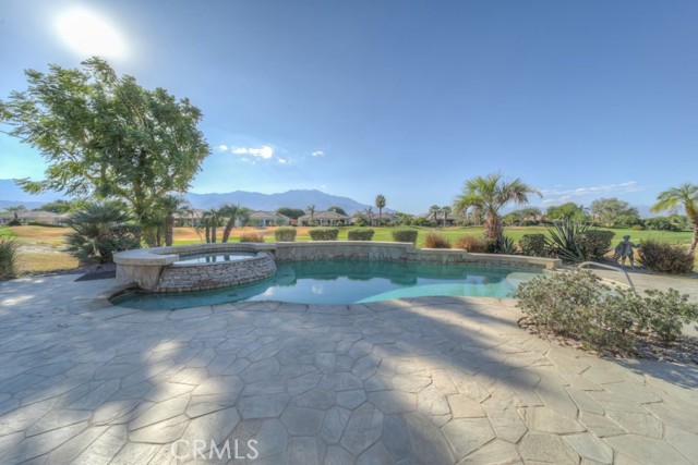 Beautiful home located on the 9th fairway of the Mission Hills North Gary Player Course in Mira Vista, a 24/7 guard gated community. A must see spacious home of 2724 Sq. Ft. Beautiful landscape & curb appeal, long driveway, gated walkway to home. As you enter into a Rotunda foyer, you will appreciate the extremely open floor plan with so much natural light & immediate viewing of the golf course, pool area & mountains. This Great Room has a corner wet bar area, electric fireplace and custom-built in cabinets & shelves along with a private dining room area with seating for 10. Kitchen is open with a center island/breakfast bar with double sliders to patio/pool area. The Primary Bedroom is spacious with a slider that leads to the pool, plus views of the golf course and mountains. Two separate doors lead to walk in closets with built-in cabinets & shelves. Primary bath has a Large Roman Shower plus a relaxing deep Tub. Guest wing has 2 bedrooms each with their own private bath. There is a spacious media room adjacent to the dinning room. Pool has a spa with flowing water into the pool. Built in gas BBQ area with covered patio, outdoor fire ring with more seating areas. 3.5 baths 2.5 car garage with built in workbench. Seller discloses SunPower Solar Lease . HOA includes pool area, tennis or pickle ball/cable/guard gated & more.rnrnPlantation Shutters, Tile throughout (no carpet) and tile baseboards are just some of the incredible features of this home. Beautiful stone decking in yard with fire pit, 8 foot deep salt water, pebble tec pool & spa, with forever Mountain views. You can see the tram light at night and stunning sunsets almost everyday!!! Automatic retractable awning with sun shades to protect the house and patio.