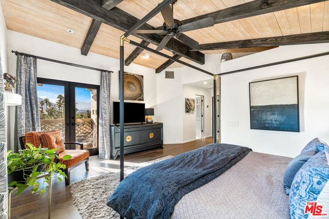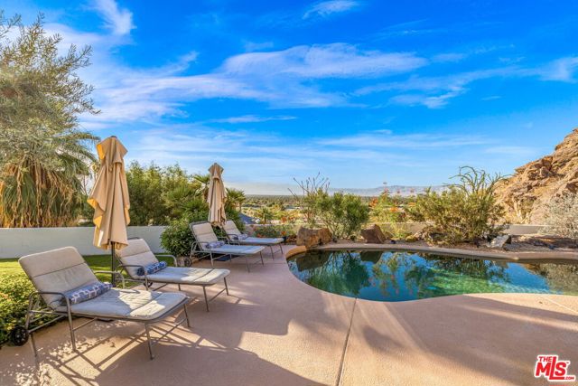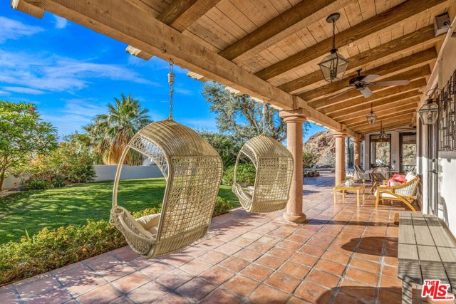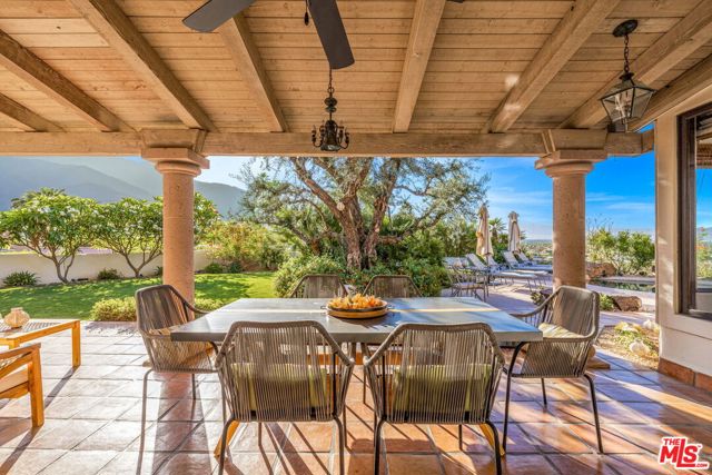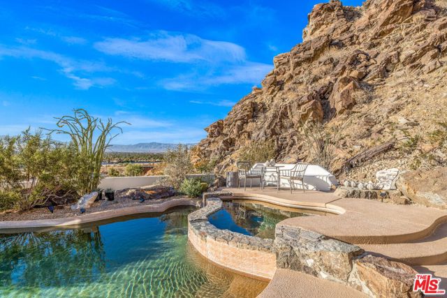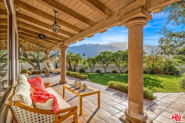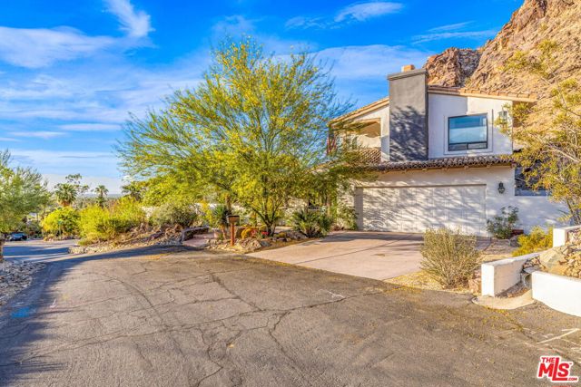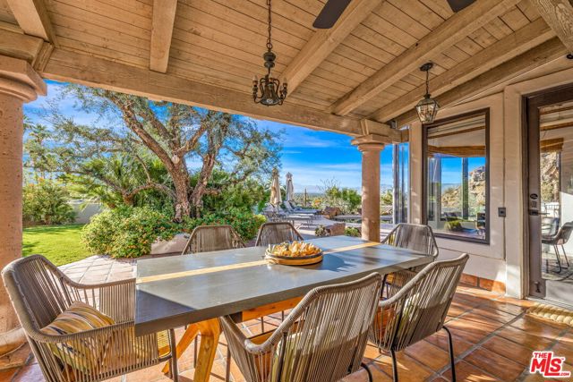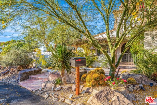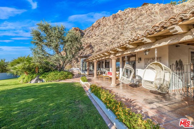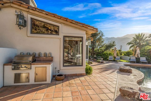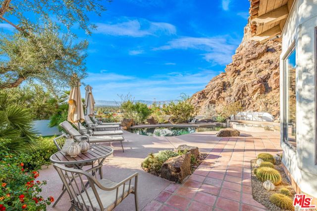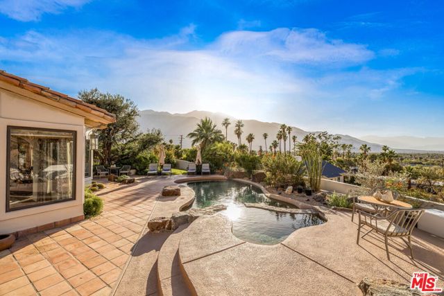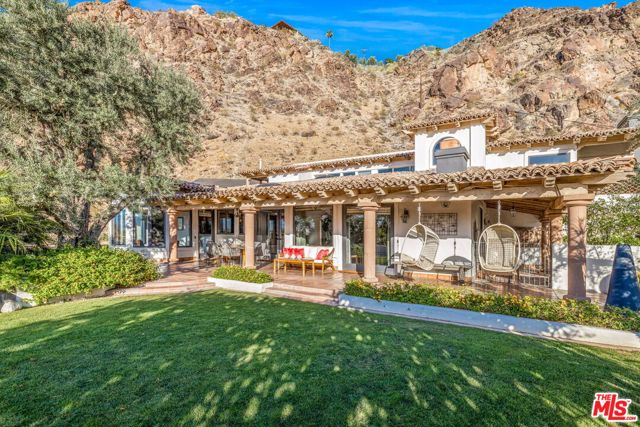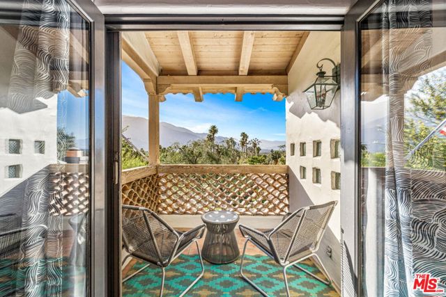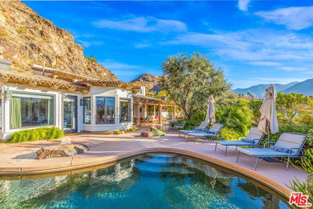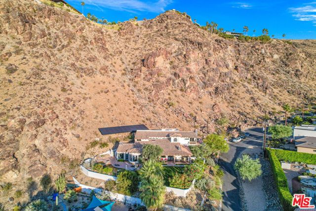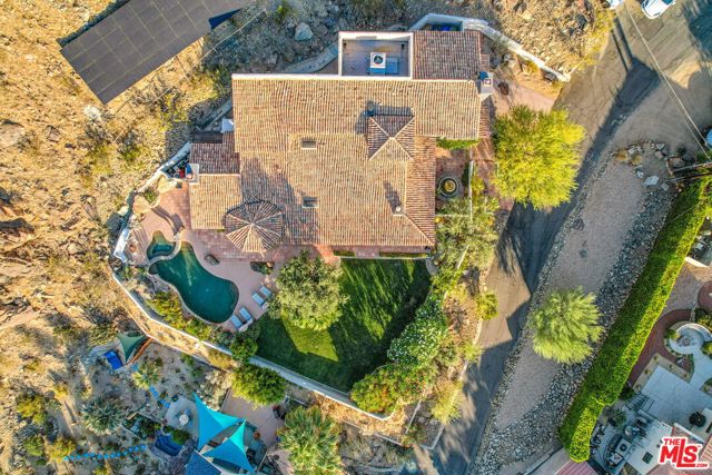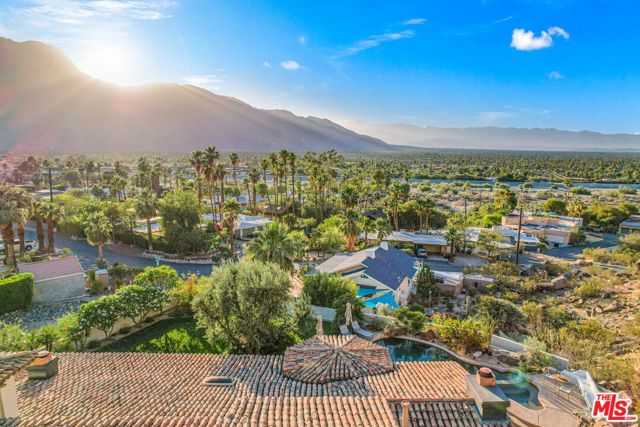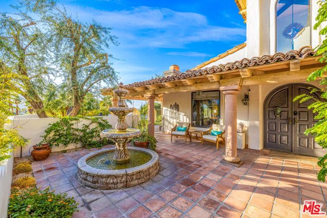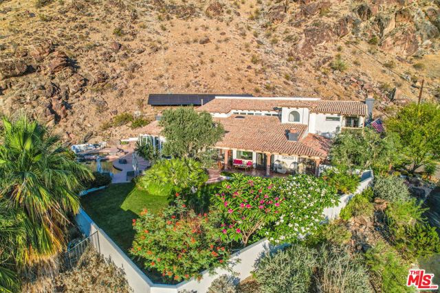 Villa Araby, a chic hacienda located on a private knoll with panoramic views of the city lights and stunning mountain vistas. This bespoke residence with weeping mortar barrel tiled roof resides seamlessly amidst rugged natural terrain. Upon entry to the garden one is entranced with wood beamed loggias, Saltillo tile pavers, a sparkling water feature and stunning pool terrace beyond. Old world double door entry engages the eye with volume wood beamed ceilings, fireplaces, hand painted tiles, arches and stone flooring. The floor plan is an entertainer’s delight encompassing intimate spaces coupled with sight lines that connect the host with their guests. Every window frames a picturesque view and invites you outside to explore the pebble tech pool and spa, an explosive Palm Springs panorama with an outdoor custom bar-b-que area. Two generous guest suites reside on the first floor. A curated kitchen features custom cabinetry, stone counters, gas cooktop, double ovens and engaging views of the garden. Wine lovers will relish the built-in hallway wine cooler located adjacent to the cozy family room that flows onto the pool deck. The primary suite resides in a private wing of the second floor. Amenities include cathedral ceilings, designed lighting, hardwood floors, walk in wardrobe and Juliette balcony to enjoy the vistas of the valley. Spa influenced primary bath has dual basins with separate soaking tub and shower. Two additional bedrooms accommodate guests with aplomb. Generous parking options offer a two car direct access garage and two additional off street spaces on a private cut de sac. Rarely does a home of this calibre become available. A once in a lifetime offering for your most discerning client.