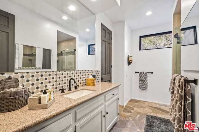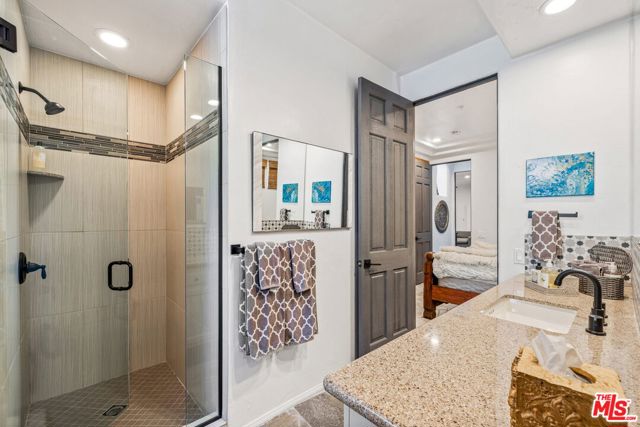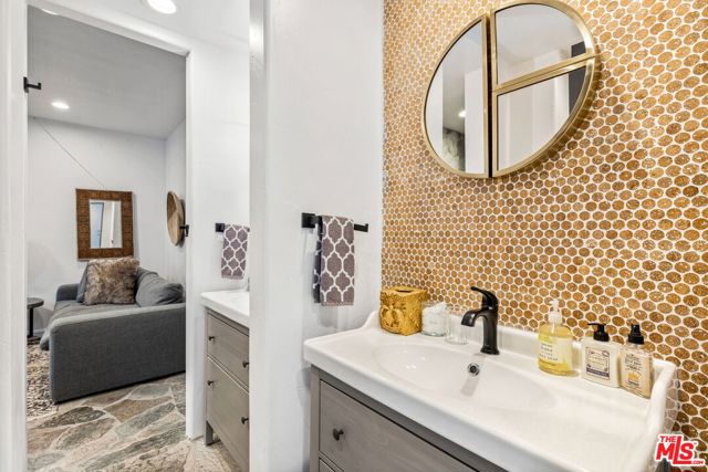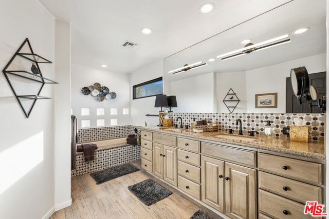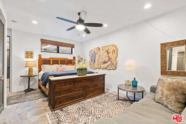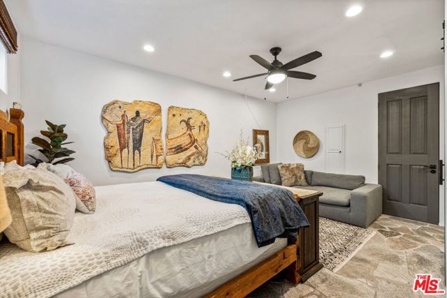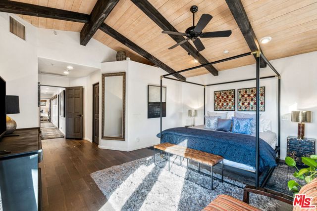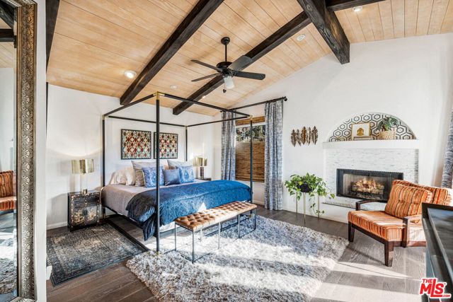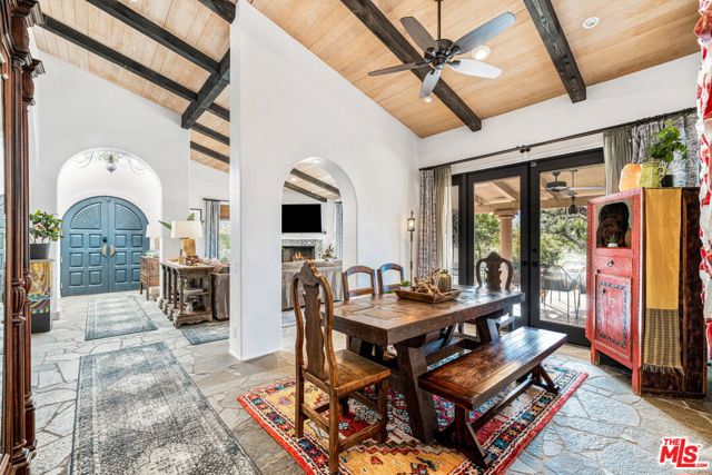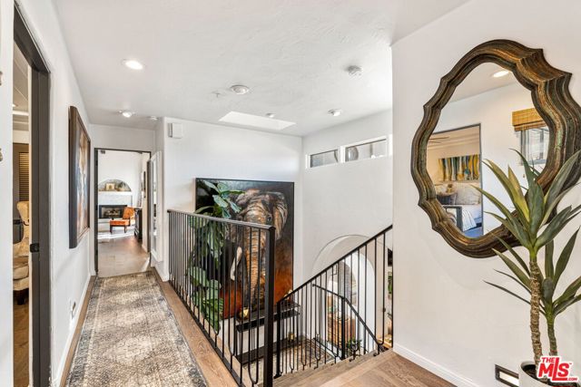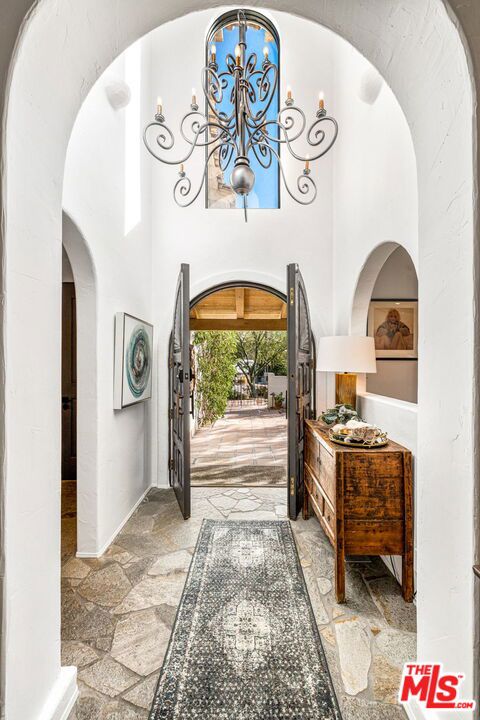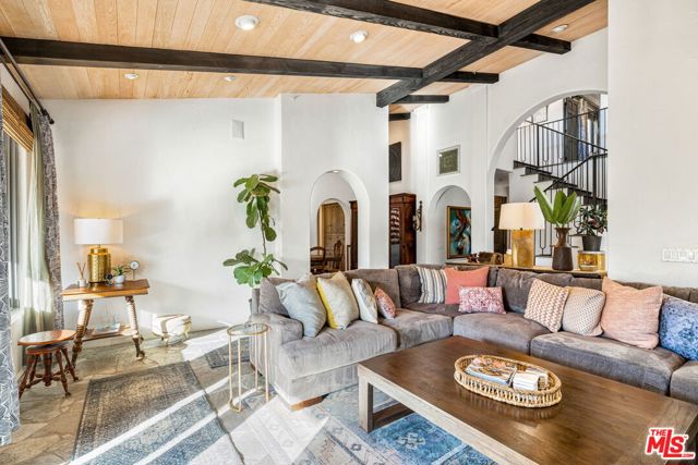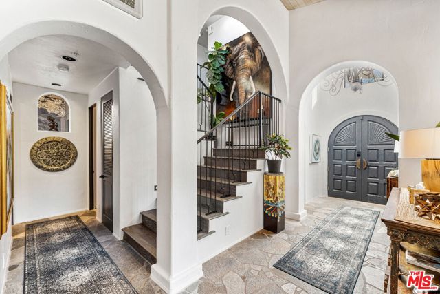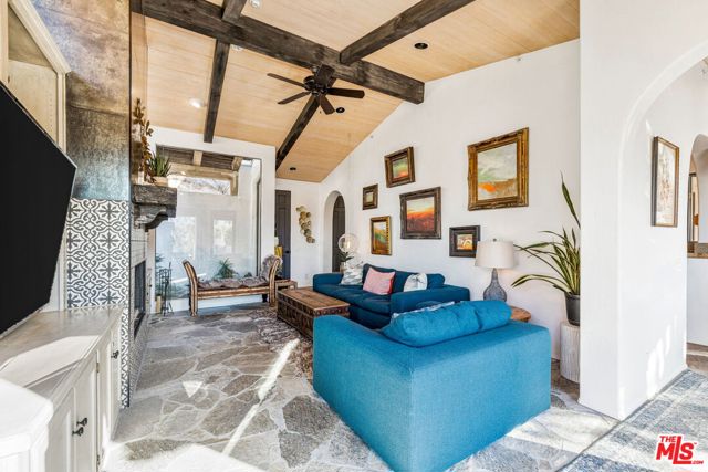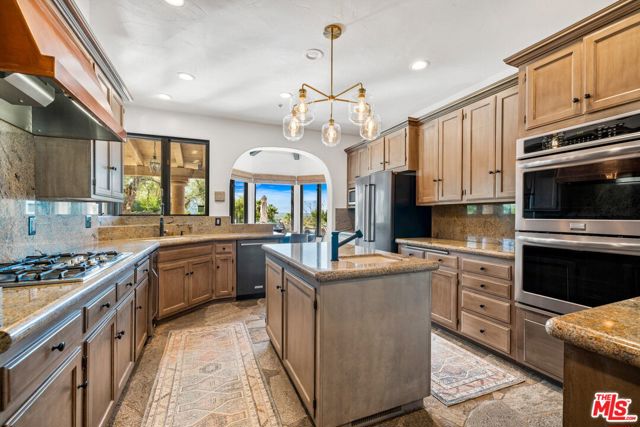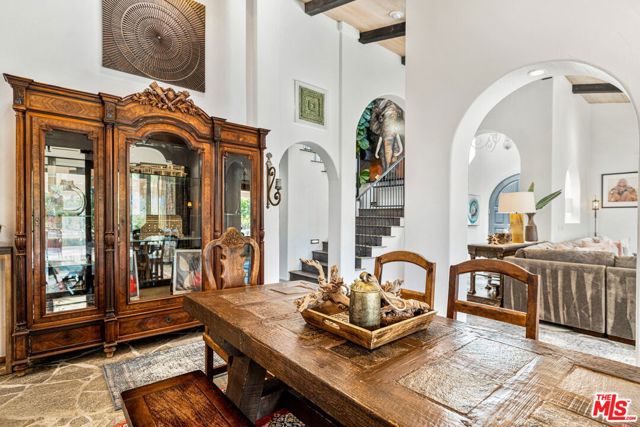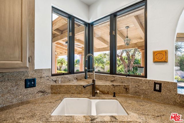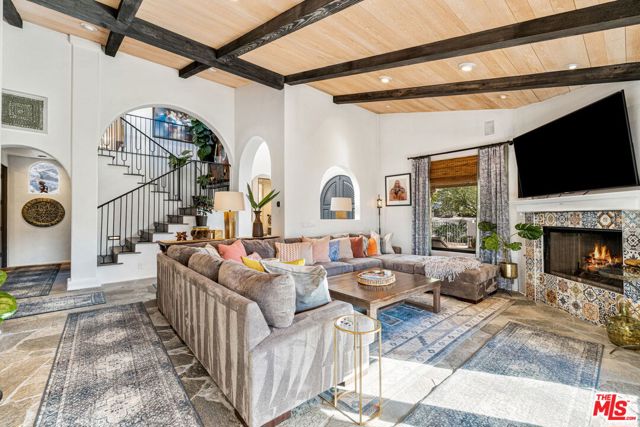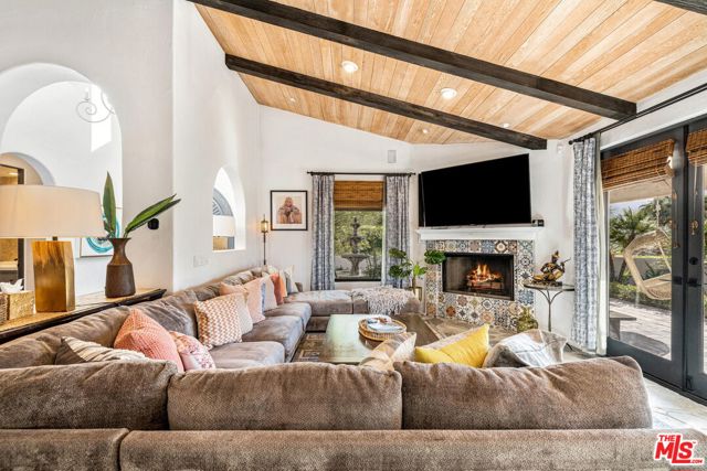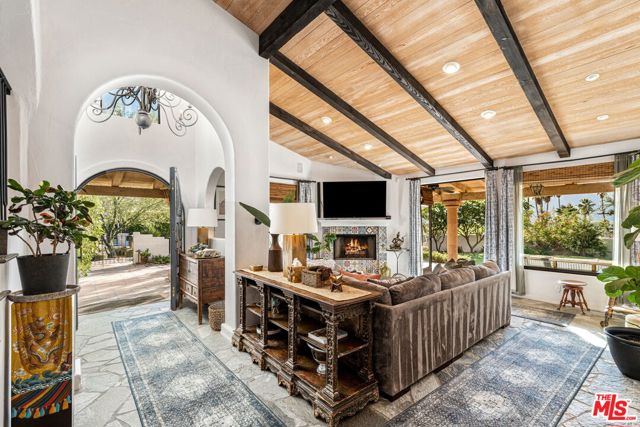 Villa Araby, a chic hacienda located on a private knoll with panoramic views of the city lights and stunning mountain vistas. This bespoke residence with weeping mortar barrel tiled roof resides seamlessly amidst rugged natural terrain. Upon entry to the garden one is entranced with wood beamed loggias, Saltillo tile pavers, a sparkling water feature and stunning pool terrace beyond. Old world double door entry engages the eye with volume wood beamed ceilings, fireplaces, hand painted tiles, arches and stone flooring. The floor plan is an entertainer’s delight encompassing intimate spaces coupled with sight lines that connect the host with their guests. Every window frames a picturesque view and invites you outside to explore the pebble tech pool and spa, an explosive Palm Springs panorama with an outdoor custom bar-b-que area. Two generous guest suites reside on the first floor. A curated kitchen features custom cabinetry, stone counters, gas cooktop, double ovens and engaging views of the garden. Wine lovers will relish the built-in hallway wine cooler located adjacent to the cozy family room that flows onto the pool deck. The primary suite resides in a private wing of the second floor. Amenities include cathedral ceilings, designed lighting, hardwood floors, walk in wardrobe and Juliette balcony to enjoy the vistas of the valley. Spa influenced primary bath has dual basins with separate soaking tub and shower. Two additional bedrooms accommodate guests with aplomb. Generous parking options offer a two car direct access garage and two additional off street spaces on a private cut de sac. Rarely does a home of this calibre become available. A once in a lifetime offering for your most discerning client.