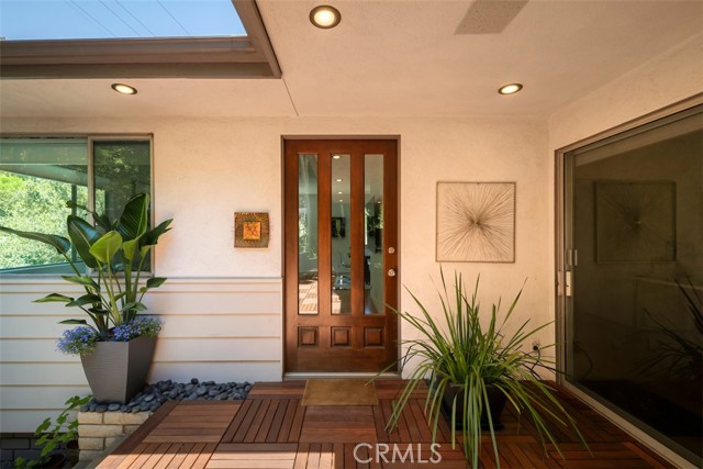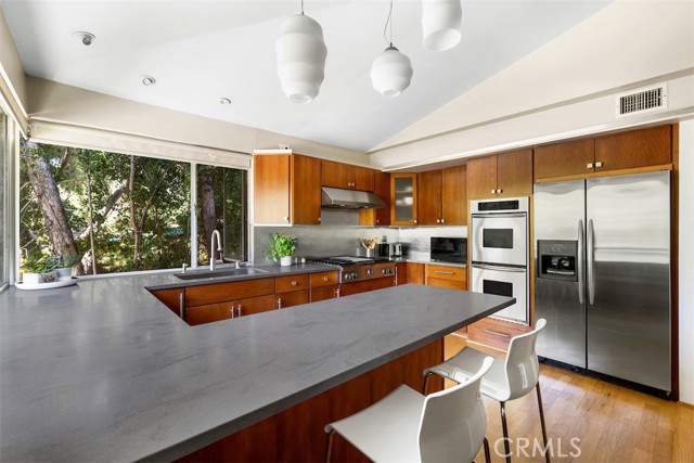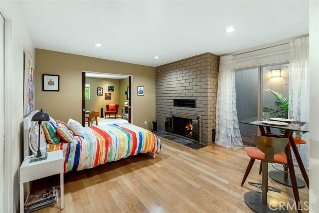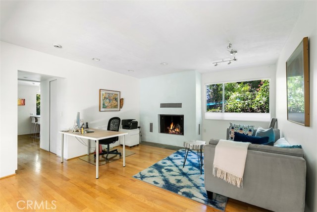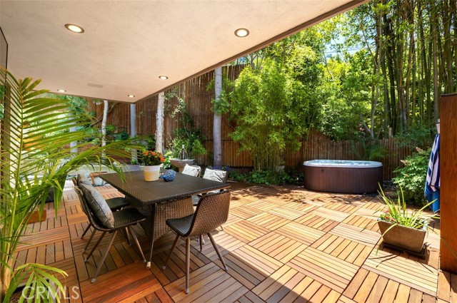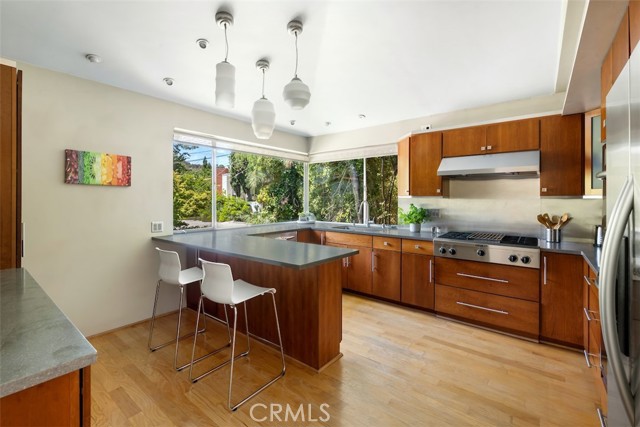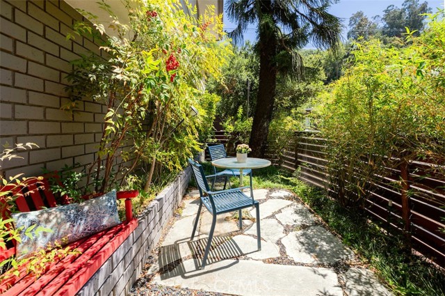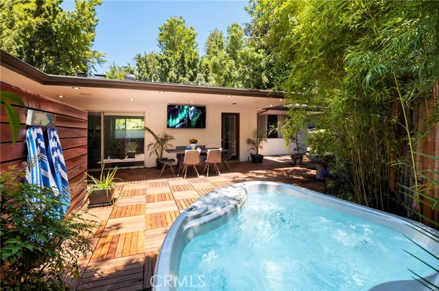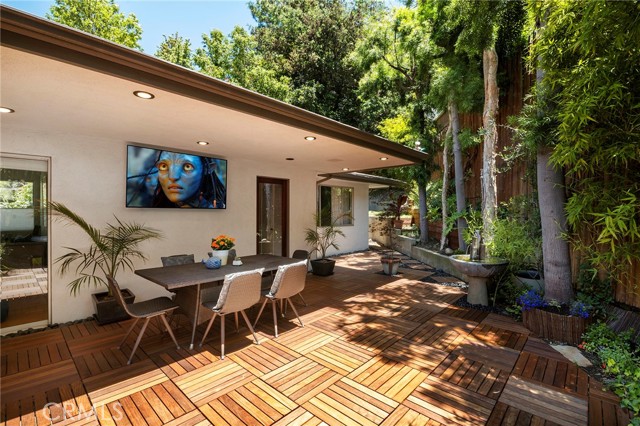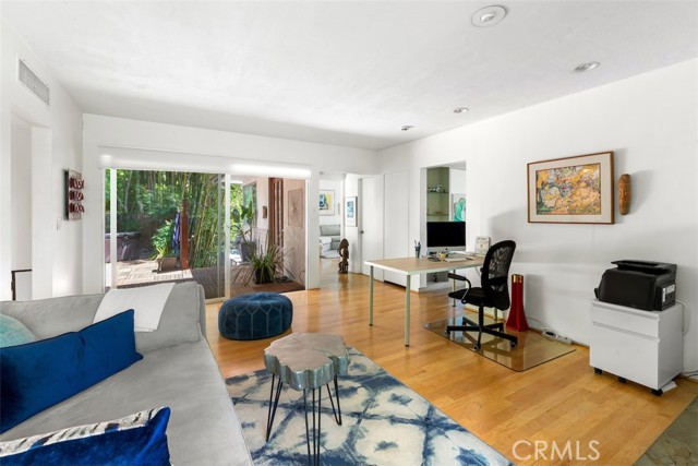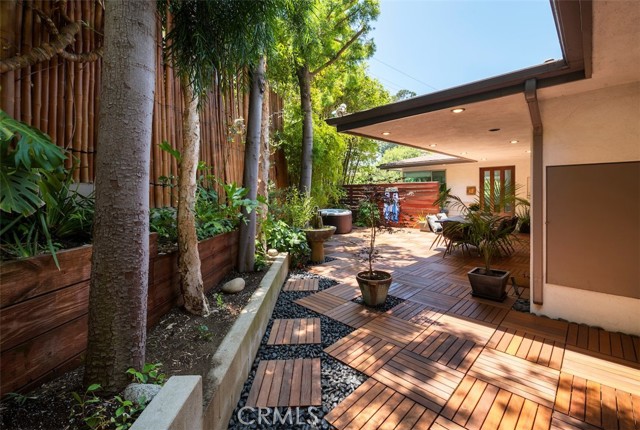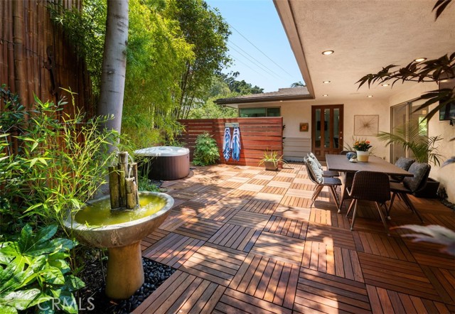 Serene and Lush Setting for this gated and beautifully remodeled Mid Century Modern Home. The home was designed by VI Quzounian, popular architect, and built by Raymond Wille, Assoc. (licensed contractor) for himself and family. Along with the living/dining room, kitchen there is a spacious bedroom suite plus a den/office (and guest bath)on the main level that leads out onto the covered patio and lush garden. Downstairs there’s a secondary bedroom suite of rooms with theater room, full bath, and kitchenette; there’s a separate entrance as garden and well. There are hardwood floors throughout, plush carpet in the bedroom, a cozy fireplace in the main floor den and downstairs, direct access garage, and green views from every room to name just a few features. Security gated and NEST smart thermostat controlled heat/air. Remodeled cook’s kitchen with stainless steel appliances, cherry cabinets, Corian counters and breakfast bar. Excellent indoor/outdoor flow perfect for relaxing on the outdoor covered patio surrounded by mature trees, and tall bamboo. The Zen inspired garden is complete with sparkling spa, fountain, and patch of elevated lawn for sunning. This home offers the quiet serenity and safety of Hollywood Hills living at its best, while just minutes from the grocery store, restaurants , and entertainment. This completely private home is the perfect location for LA living.