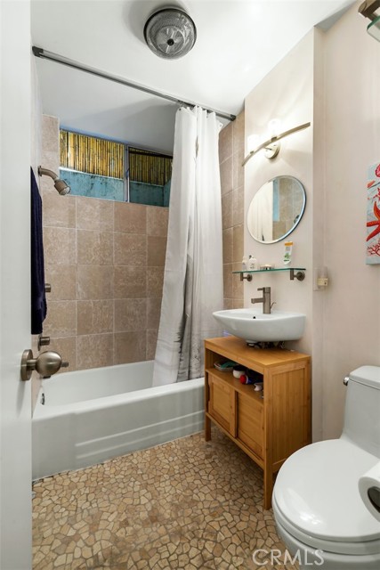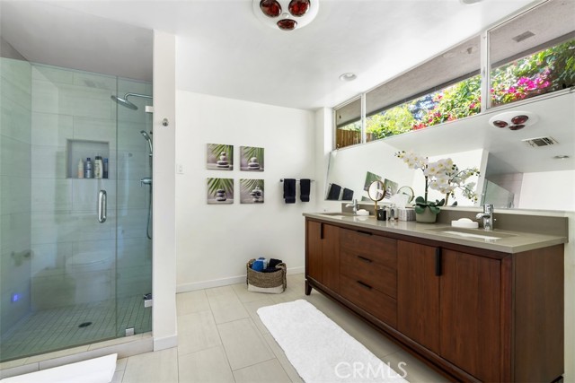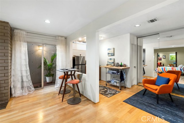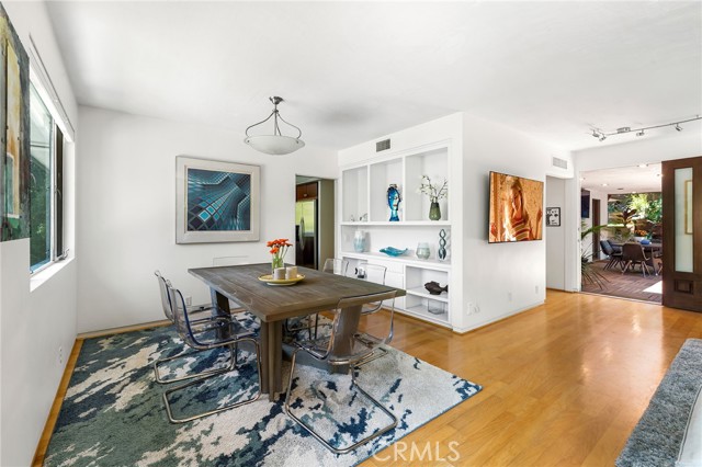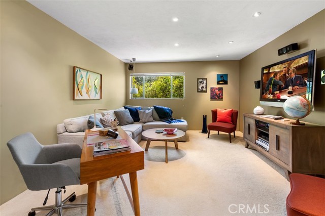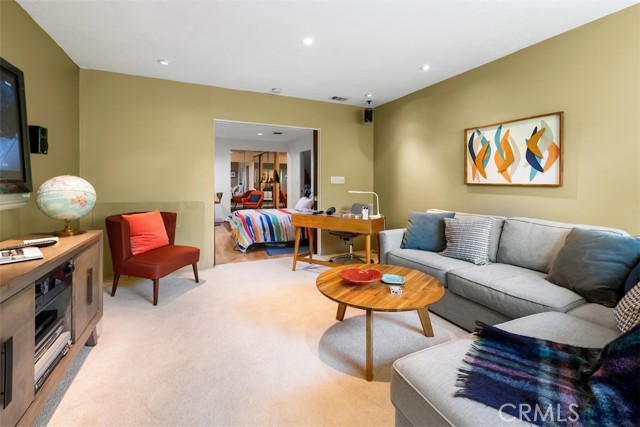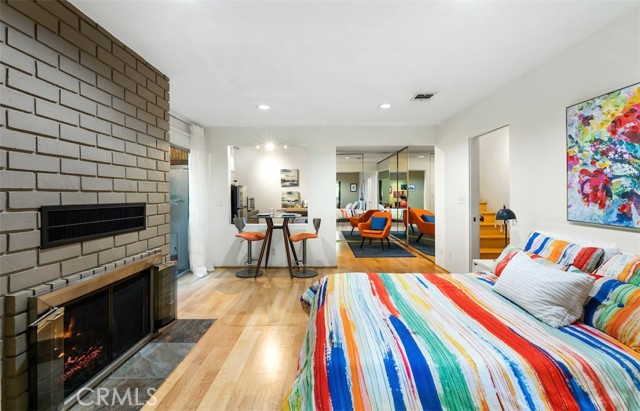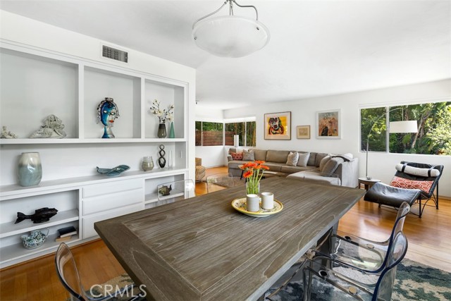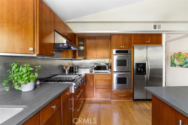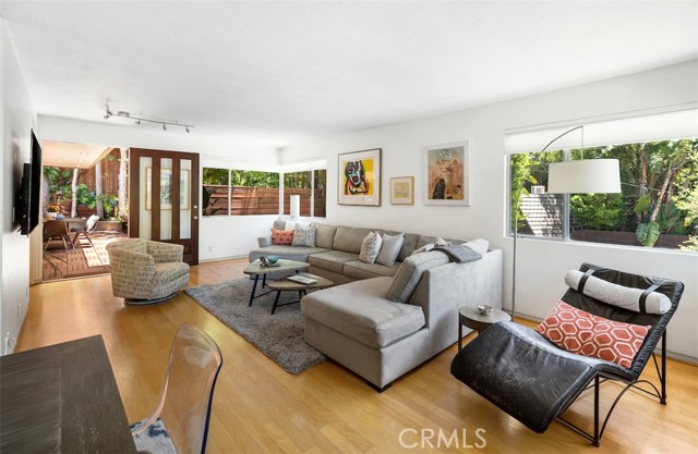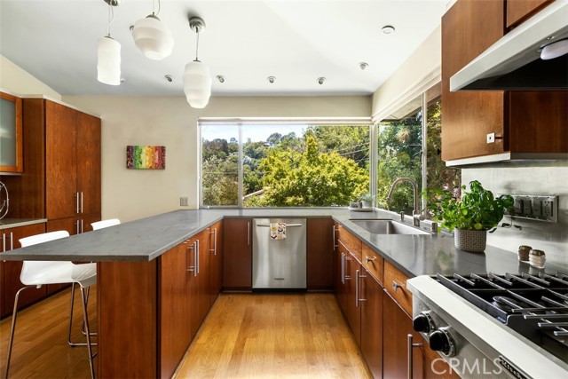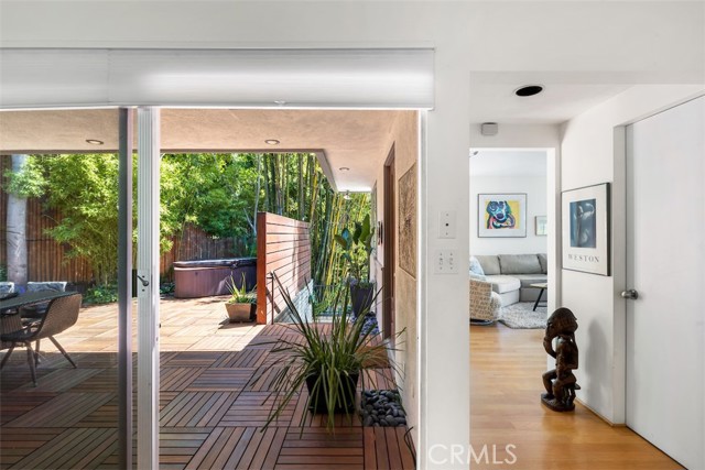 Serene and Lush Setting for this gated and beautifully remodeled Mid Century Modern Home. The home was designed by VI Quzounian, popular architect, and built by Raymond Wille, Assoc. (licensed contractor) for himself and family. Along with the living/dining room, kitchen there is a spacious bedroom suite plus a den/office (and guest bath)on the main level that leads out onto the covered patio and lush garden. Downstairs there’s a secondary bedroom suite of rooms with theater room, full bath, and kitchenette; there’s a separate entrance as garden and well. There are hardwood floors throughout, plush carpet in the bedroom, a cozy fireplace in the main floor den and downstairs, direct access garage, and green views from every room to name just a few features. Security gated and NEST smart thermostat controlled heat/air. Remodeled cook’s kitchen with stainless steel appliances, cherry cabinets, Corian counters and breakfast bar. Excellent indoor/outdoor flow perfect for relaxing on the outdoor covered patio surrounded by mature trees, and tall bamboo. The Zen inspired garden is complete with sparkling spa, fountain, and patch of elevated lawn for sunning. This home offers the quiet serenity and safety of Hollywood Hills living at its best, while just minutes from the grocery store, restaurants , and entertainment. This completely private home is the perfect location for LA living.