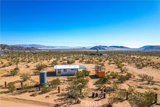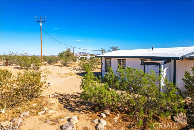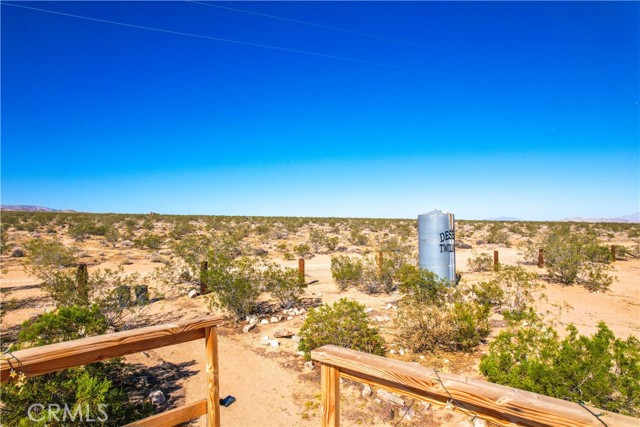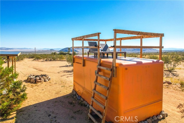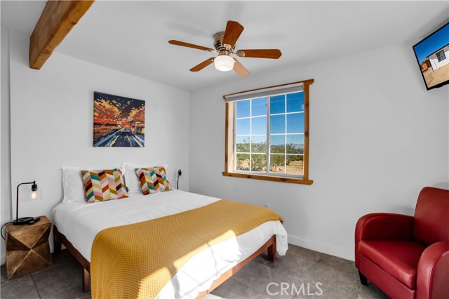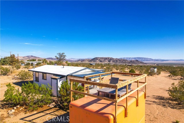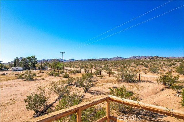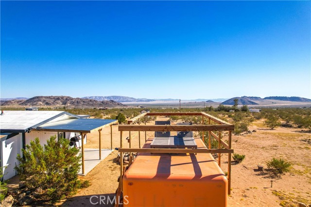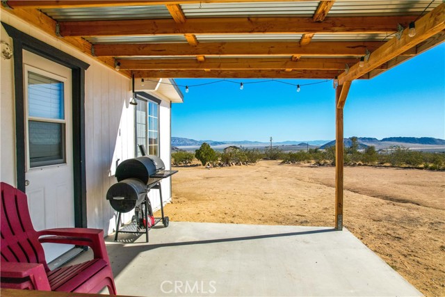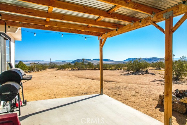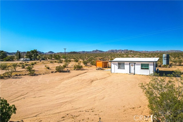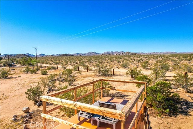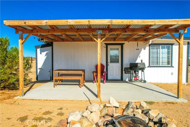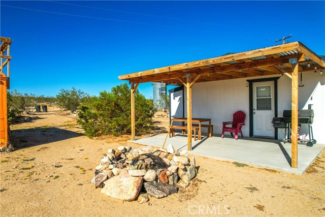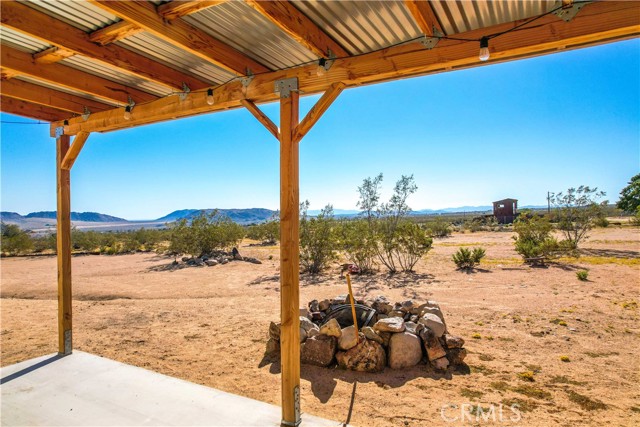 If you’ve been looking for the perfect headquarters for Hi-desert adventure, look no further than this fantastic 1 bedroom, 1 bath cabin nestled on 5 secluded acres in Johnson Valley! As you approach from easily accessible Repton Avenue, you’ll be stunned by the incredible panoramic vistas that surround you here. A freshly painted facade greets you as you arrive at the property. Enter the home to find yourself inside a spacious open concept main living area with high wood beamed ceilings, mini-split for perfect climate control, big windows to let in the magnificient mountain views, and tile floors that flow throughout the space. The kitchen area features new cabinets with stylish butcher block countertops, electric range and refridgerator for all the necessities. The bedroom is an inviting retreat with rustic wood beam accent, nicely sized closet, and plenty of room to stretch out in. The generously sized bath features a subway tiled walk-in shower, recessed lighting, and stacked laundry facilities for easy access. Step out the back doors onto the shaded paved patio, where you will enjoy even more stellar views. You’ll love the big stone fire pit, perfect for entertaining, and the cool raised stargazing tower designed to let you get up close and personal with the incredible night skies. You’ll love knowing that the property is already hooked up to the Bighorn Water District as well. Johnson Valley is an incredible location for all kinds of outdoor desert activities; meanwhile the property is only 20 minutes to the town of Yucca Valley, so you don’t have to compromise between amenities and serenity. Book a showing today to see this great opportunity to own your own desert escape!