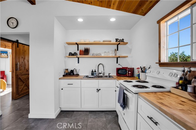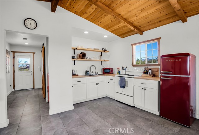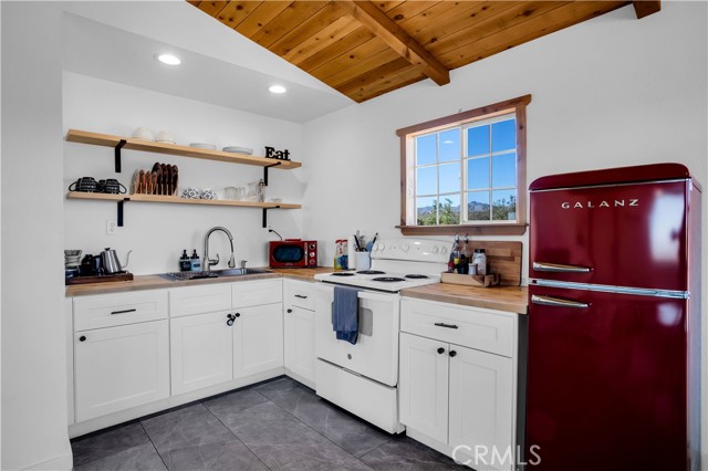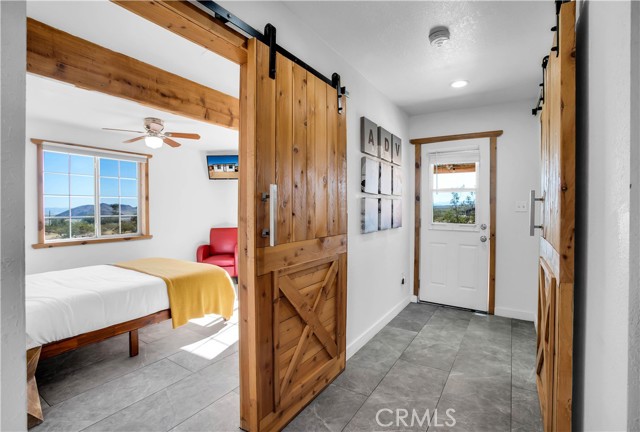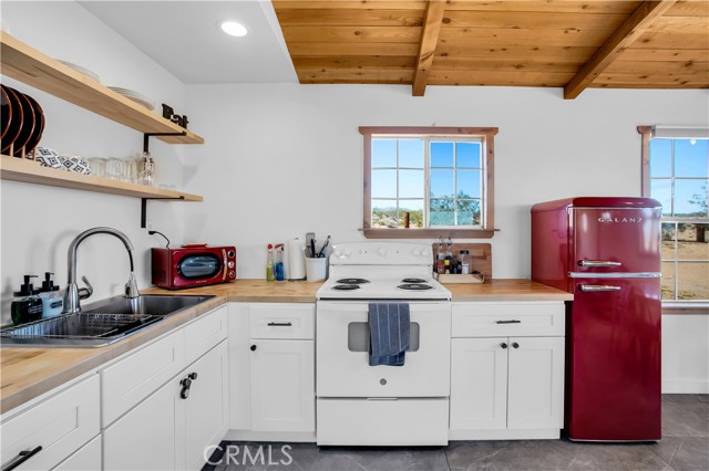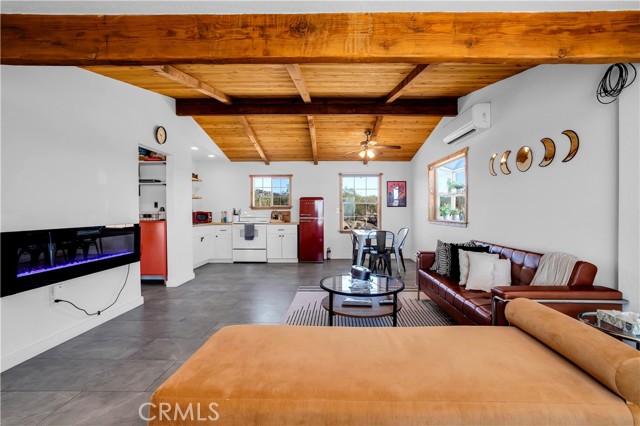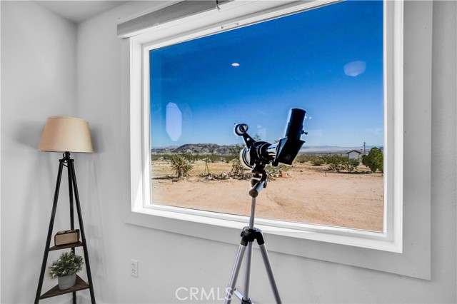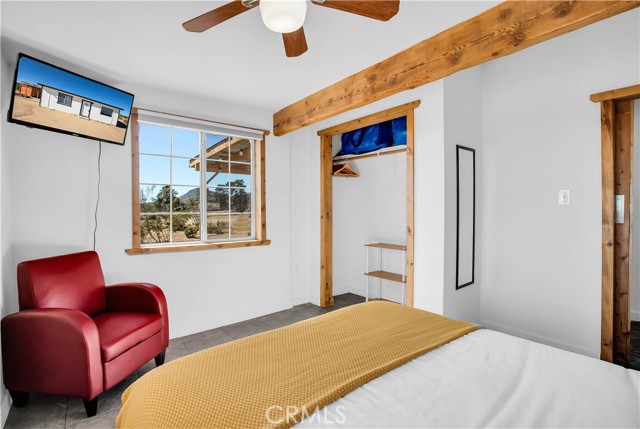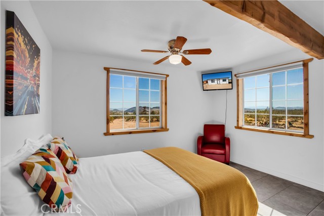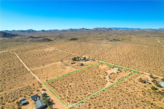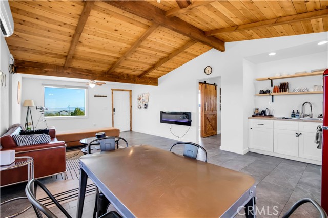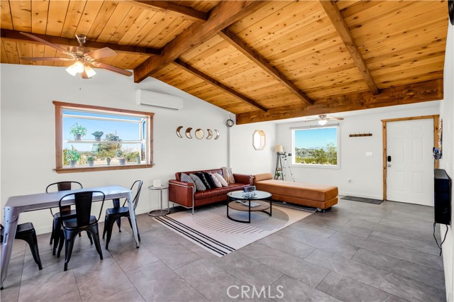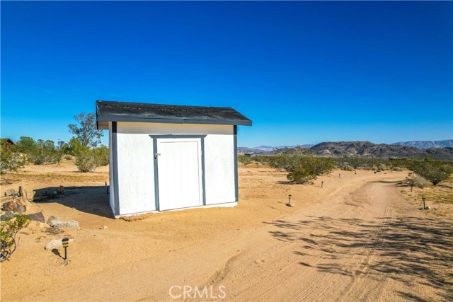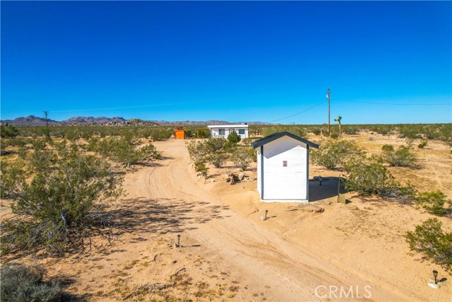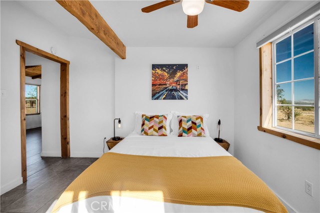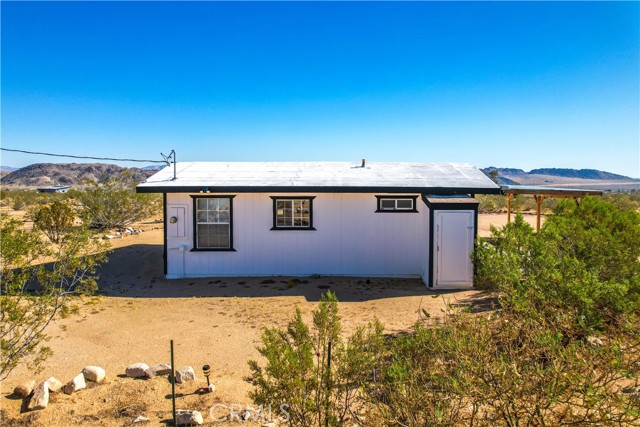 If you’ve been looking for the perfect headquarters for Hi-desert adventure, look no further than this fantastic 1 bedroom, 1 bath cabin nestled on 5 secluded acres in Johnson Valley! As you approach from easily accessible Repton Avenue, you’ll be stunned by the incredible panoramic vistas that surround you here. A freshly painted facade greets you as you arrive at the property. Enter the home to find yourself inside a spacious open concept main living area with high wood beamed ceilings, mini-split for perfect climate control, big windows to let in the magnificient mountain views, and tile floors that flow throughout the space. The kitchen area features new cabinets with stylish butcher block countertops, electric range and refridgerator for all the necessities. The bedroom is an inviting retreat with rustic wood beam accent, nicely sized closet, and plenty of room to stretch out in. The generously sized bath features a subway tiled walk-in shower, recessed lighting, and stacked laundry facilities for easy access. Step out the back doors onto the shaded paved patio, where you will enjoy even more stellar views. You’ll love the big stone fire pit, perfect for entertaining, and the cool raised stargazing tower designed to let you get up close and personal with the incredible night skies. You’ll love knowing that the property is already hooked up to the Bighorn Water District as well. Johnson Valley is an incredible location for all kinds of outdoor desert activities; meanwhile the property is only 20 minutes to the town of Yucca Valley, so you don’t have to compromise between amenities and serenity. Book a showing today to see this great opportunity to own your own desert escape!