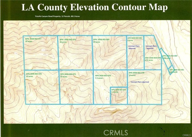 This Agoura Hills Development Opportunity is located just approximately 9 miles from the Beautiful Malibu Beaches, and just around the corner from Multimillion Dollar Homes and Exclusive Gated Communities. This Project site is Located in the unincorporated area of Los Angeles County-Agoura Hills on Triunfo Canyon Rd. The 80.5 acre property consist of 12 APN’s. 3 of the lots have Geology Reports, all lots have an ariel Survey, Topography Map, Botanical Survey, Arborist Letter, certified easements and grant deeds. All properties/Lots have access to Municipal Water, Power and Sewer Connection in Street of Triunfo Canyon Rd.