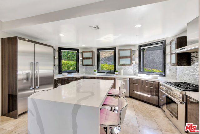 Experience the serene lifestyle in this custom built designer 2 story retreat perfect for entertaining &/ or recharging. Located to appreciate privacy & the tranquil Hollywood Hills vibe, the wow factor greets you upon entering the dramatic marble foyer. Top level boasts expansive living room with high ceilings & fireplace. Both the living & dining rooms have balconies made to soak in the glorious canyon & mountain views. Natural light fills the space. The Italian designed kitchen has stunning quartz countertops, large center island perfectly sized for 6 people, & stainless steel Thermador appliances. Views from every room. The sophisticated primary Ensuite features stylish fireplace perfect for unwinding plus oversized his & her closets, & massage room. The primary bathroom has 2 separate vanities, a jacuzzi tub plus steam shower. All other Ensuite bedrooms are smartly designed with views. Bottom floor opens to private lush backyard with covered seating, BBQ, raised private hot tub area complete with relaxing waterfall. Home comes fully equipped security system including cameras, a central vacuum system, Energy Efficient LED lights, 9-ton dual zone heating & air conditioning system, & new tankless water heater. This home offers comfort, security & peace of mind necessary to enjoy life. Come experience this one of a kind retreat by Beachwood Canyon.