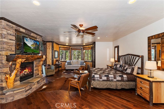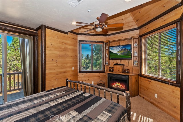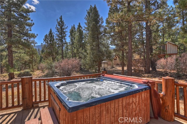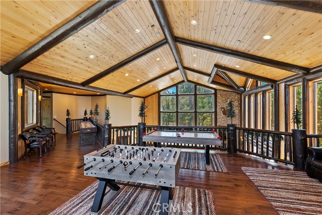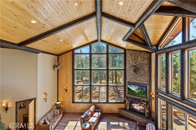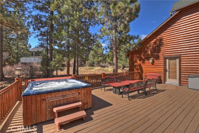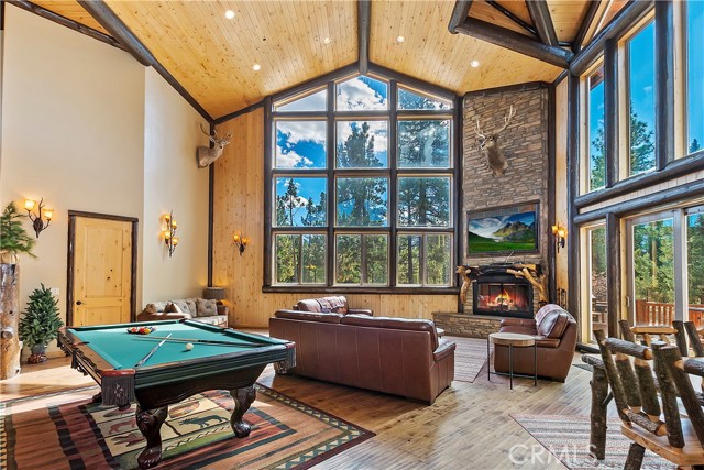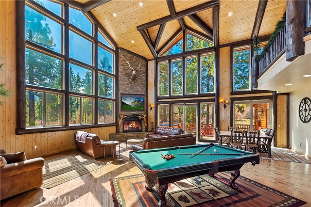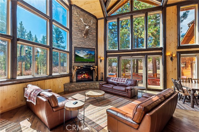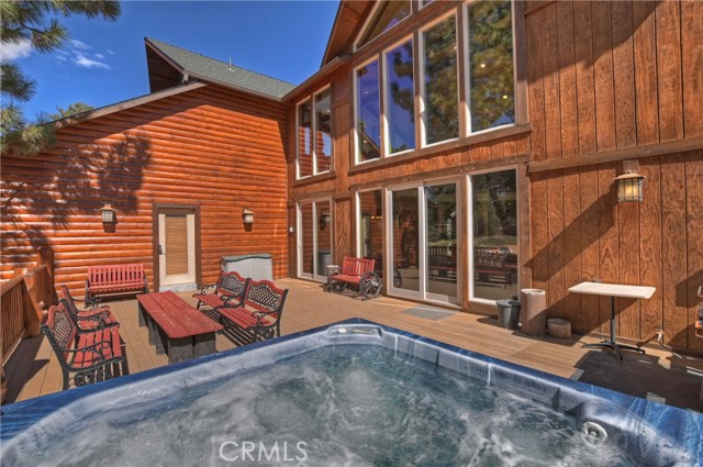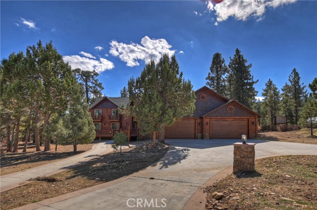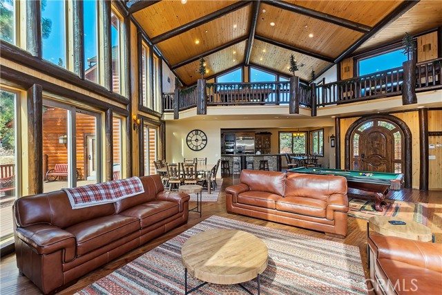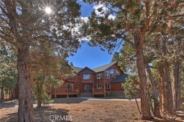 From the moment you arrive at this custom log style home you will know you have found the one ~ Open the door and be greeted by soaring high ceilings and log accents throughout ~ The abundant windows are ideal for watching the snow fall while listening to the crackling fire ~ The flow of the open floor plan is designed for entertaining ~ Gather with friends for a holiday feast cooked in your gourmet kitchen, then ascend to the loft bar for after dinner cocktails and games ~ When it’s time to relax slip outside for a soak in the spa and take in the stars, then retreat to your master suite complete with a gorgeous fireplace, sitting area, walk in shower, soaking tub, enormous walk in closet and a private deck ~ There are three more bedrooms, one is a second master suite complete with a fireplace and private balcony, and a total of six bathrooms to accommodate all of your loved ones ~ Are you a car lover? You will be thrilled with the 5 car garage ~ All of this sets on over an acre of pure bliss in the desired neighborhood of Meadow Brook Estates ~ Just ten minutes to the heart of Big Bear Lake but far enough off the main road so you won’t hear the noise of traffic ~ Just take a deep breath of the freshest air, sit back and relax ~ You can only hear the sound of the wind.
