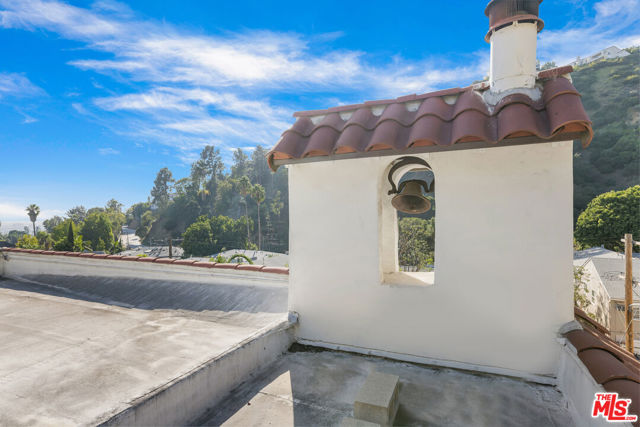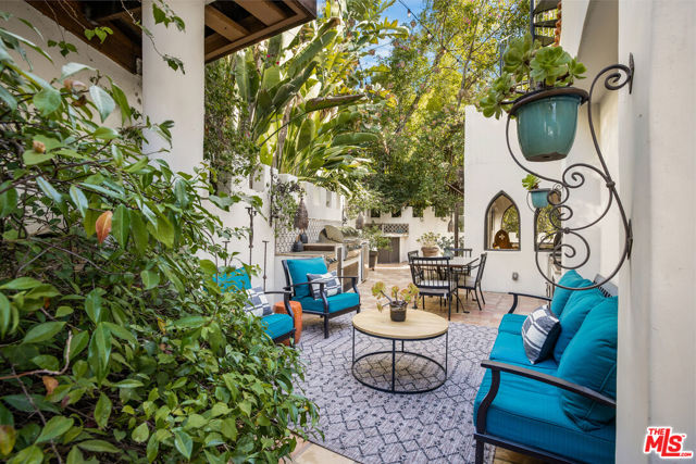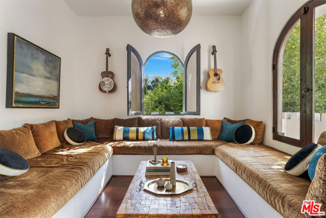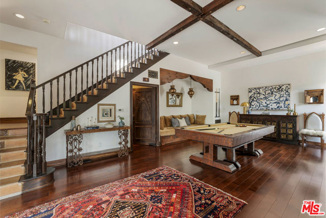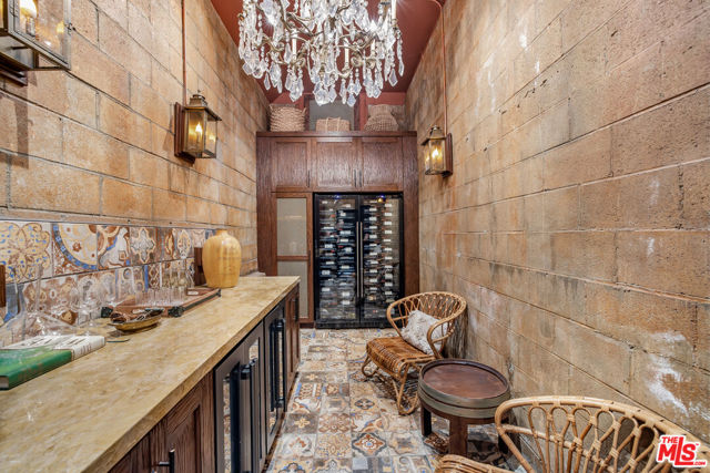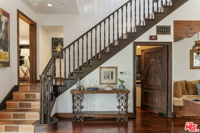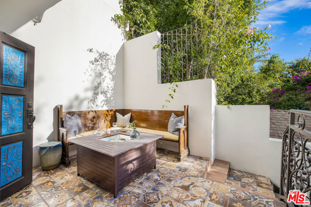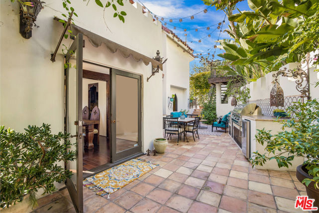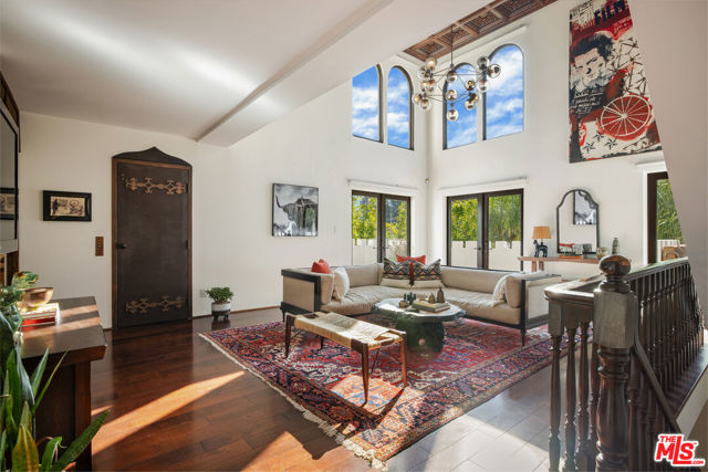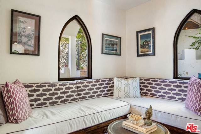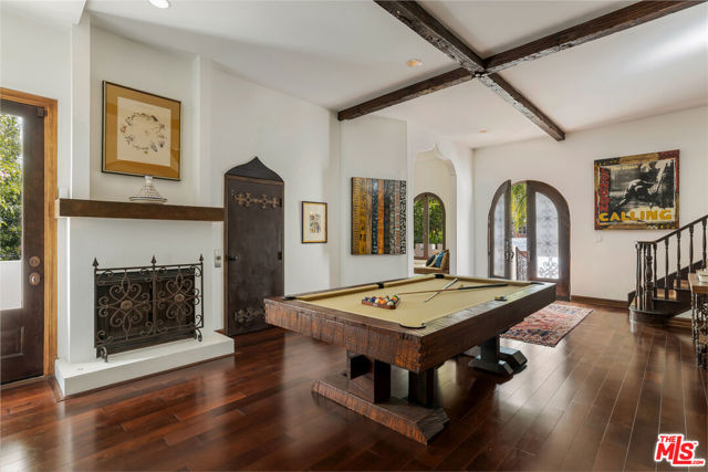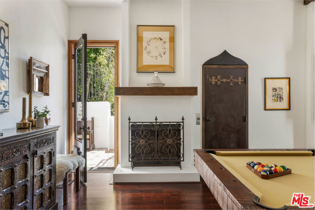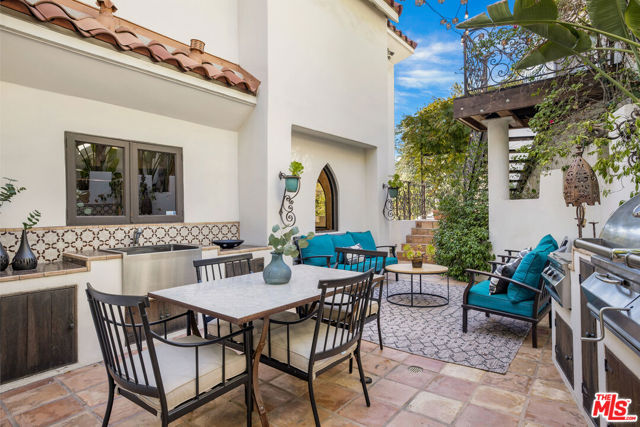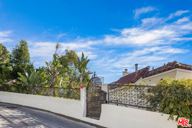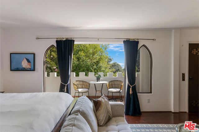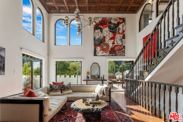 8054 Fareholm Drive in the Hollywood Hills, aka Fareholm Castle is the breathtaking work of renowned Spanish designer Jorge Dalinger. He seamlessly blends Spanish details and California lifestyle, and the results are stunning. This gated property is nestled in the foothills just a few blocks above the iconic Sunset Strip. It’s big and grand. It’s an updated twist on fairytale architecture with dramatic rooms and whimsical details. The entry hall is where the fun starts. Currently used as a lounge with pool table, it has chic Moroccan details and a sedari-style seating area. A stately tiled staircase brings you from the entry lounge to the beautiful bright living space with two stories of windows and a richly detailed ceiling a Jorge Dalinger signature feature. There is wall space for large-scale art and easy access to the big outdoor open-air lounge. Lovely for sunning, reading, relaxing and entertaining. Also off the living room is the gourmet kitchen with a sweet and cozy breakfast nook and the stately dining room which flows to the outdoor kitchen with grill, sink, the draft beer system, eating area and conversation spots. This is all woven into the castle charm among the pink bougainvillea and green palm fronds. Back inside are four bedrooms and four bathrooms. A top floor primary suite with balcony, another suite with balcony off the entry lounge, plus two additional bedrooms and bathrooms. That’s not all, there is a music room downstairs that would work for hobbies or hang outs or movies or more. And a tucked away wine cellar with a cozy outdoor tasting area. And to make it all easy, there is a service elevator to take things from floor to floor. All of this close to shops, restaurants, and gyms. Just a few blocks from Bristol Farms and Almor Wine & Spirts for those last-minute entertaining restocks. Unique and easy, classic, and fun. An architectural personification of happiness. Come see this beautiful home for yourself. We’d love to show you.
