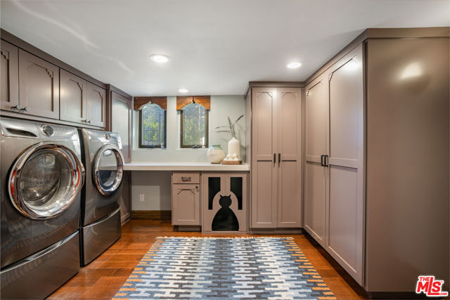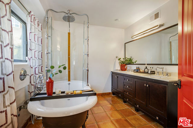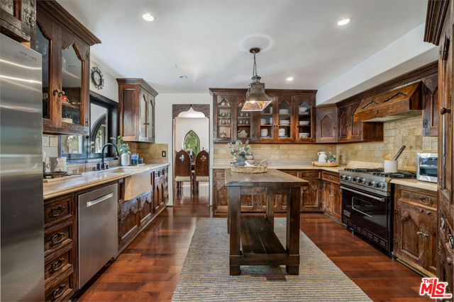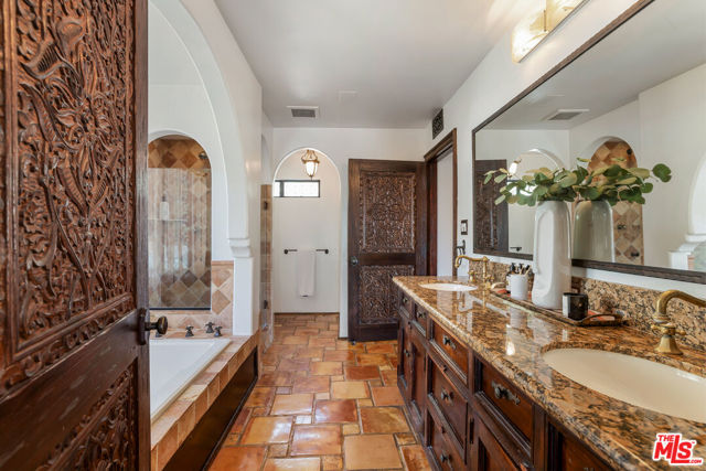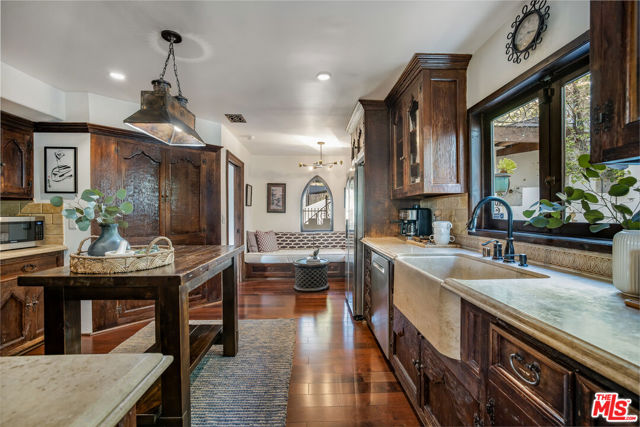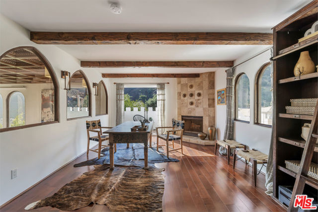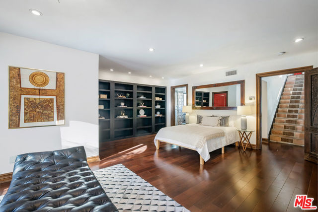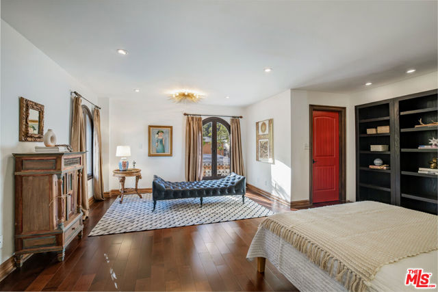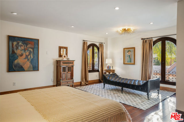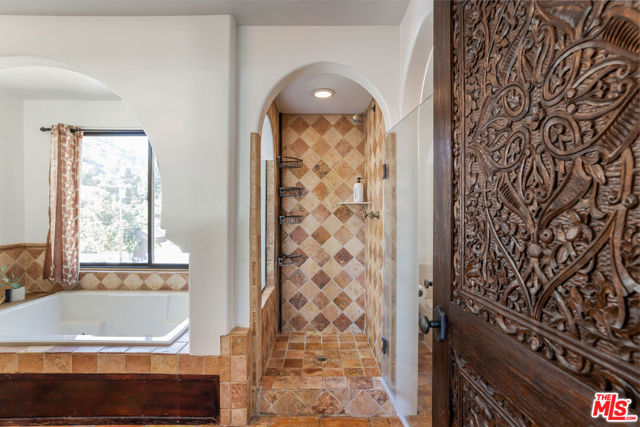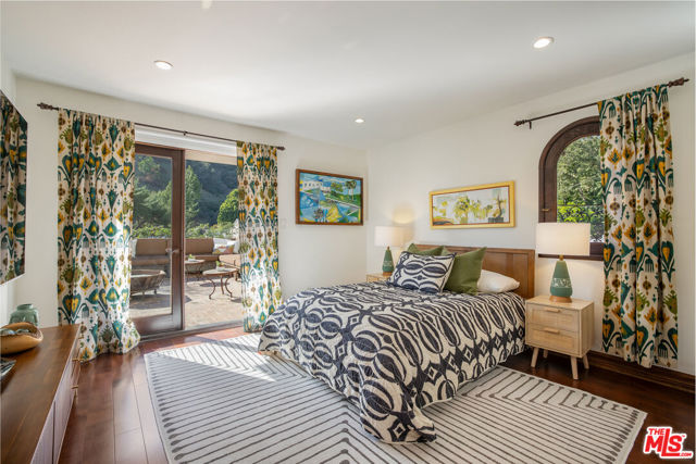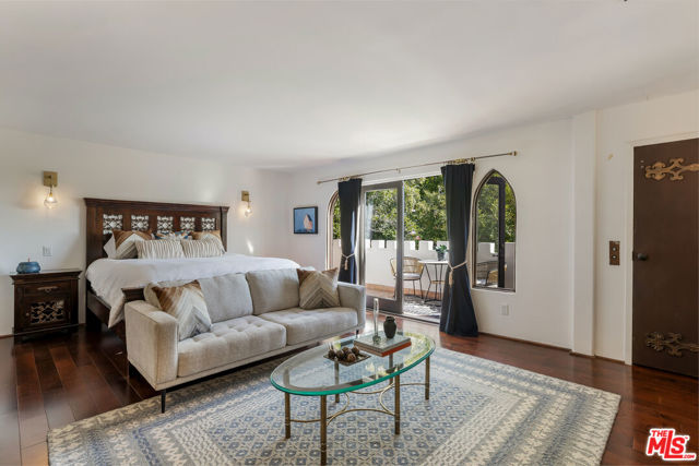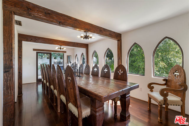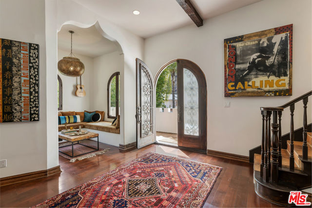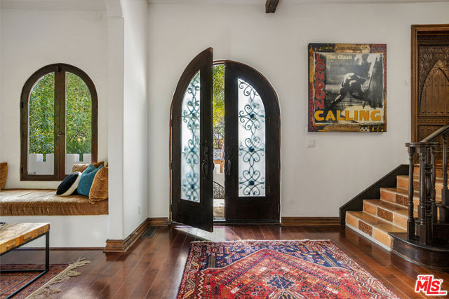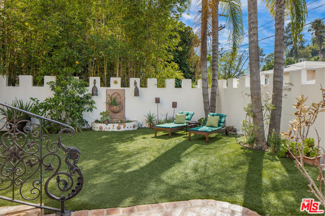 8054 Fareholm Drive in the Hollywood Hills, aka Fareholm Castle is the breathtaking work of renowned Spanish designer Jorge Dalinger. He seamlessly blends Spanish details and California lifestyle, and the results are stunning. This gated property is nestled in the foothills just a few blocks above the iconic Sunset Strip. It’s big and grand. It’s an updated twist on fairytale architecture with dramatic rooms and whimsical details. The entry hall is where the fun starts. Currently used as a lounge with pool table, it has chic Moroccan details and a sedari-style seating area. A stately tiled staircase brings you from the entry lounge to the beautiful bright living space with two stories of windows and a richly detailed ceiling a Jorge Dalinger signature feature. There is wall space for large-scale art and easy access to the big outdoor open-air lounge. Lovely for sunning, reading, relaxing and entertaining. Also off the living room is the gourmet kitchen with a sweet and cozy breakfast nook and the stately dining room which flows to the outdoor kitchen with grill, sink, the draft beer system, eating area and conversation spots. This is all woven into the castle charm among the pink bougainvillea and green palm fronds. Back inside are four bedrooms and four bathrooms. A top floor primary suite with balcony, another suite with balcony off the entry lounge, plus two additional bedrooms and bathrooms. That’s not all, there is a music room downstairs that would work for hobbies or hang outs or movies or more. And a tucked away wine cellar with a cozy outdoor tasting area. And to make it all easy, there is a service elevator to take things from floor to floor. All of this close to shops, restaurants, and gyms. Just a few blocks from Bristol Farms and Almor Wine & Spirts for those last-minute entertaining restocks. Unique and easy, classic, and fun. An architectural personification of happiness. Come see this beautiful home for yourself. We’d love to show you.