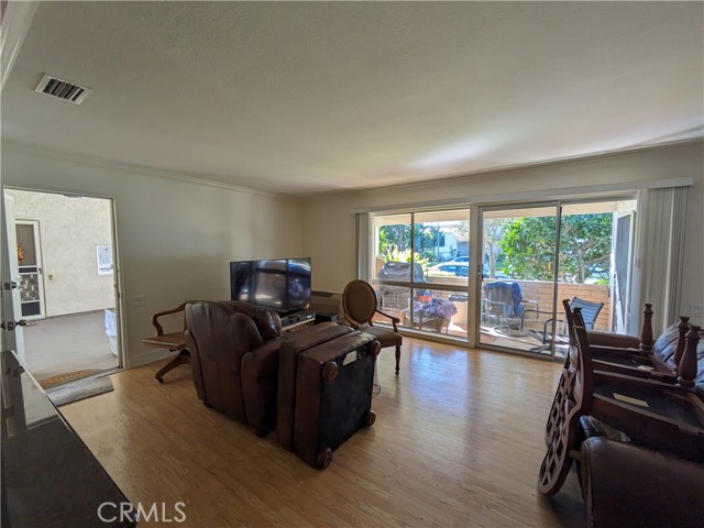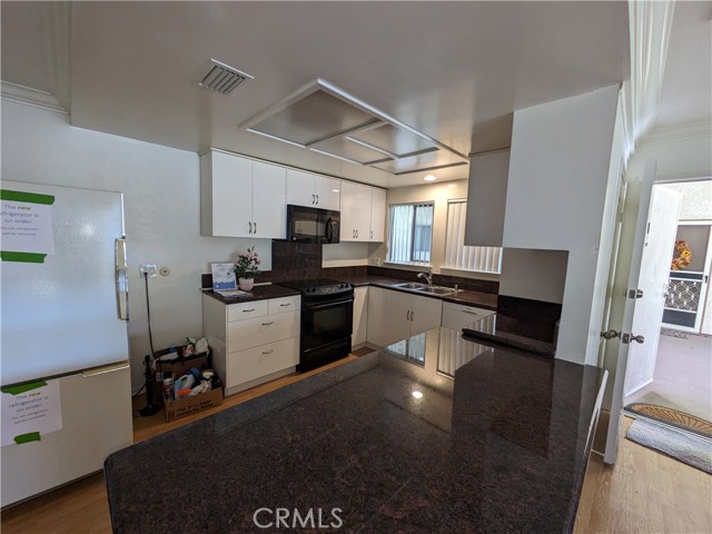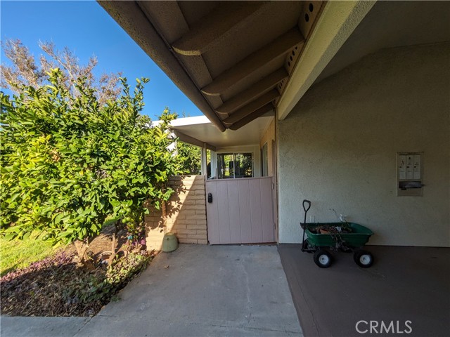 Welcome to 24 hour gated community-Laguna Woods Village. Single level end unit condominium (no one above or below). Casa Linda floorplan – 2 bedrooms & 2 baths. No steps from the Avenida Carmel street parking to the front door. Street parking on Avenida Carmel is a nice convenience. Central heat and air conditioning. Enclosed patio or atrium off the 2nd bedroom. A separate outdoor covered patio off the living room is very relaxing and tranquil. Two fruit trees located in front of the patio. Very private and quiet location. Fresh paint & granite counters in remodeled kitchen. Newer dishwasher. Remodeled walk-in shower in main bathroom. Crown molding throughout home. Wood like vinyl flooring, no carpeting. One covered carport. Close to gate 1. Enjoy resort style community, golf courses, swimming pools, gym, billiard rooms, game rooms, library and garden center. Close to shopping center and highway. The adult community is for age 55+. The condo can be partially furnished with bedroom furniture and living room furniture. This home includes a refrigerator, washer and dryer in the unit.