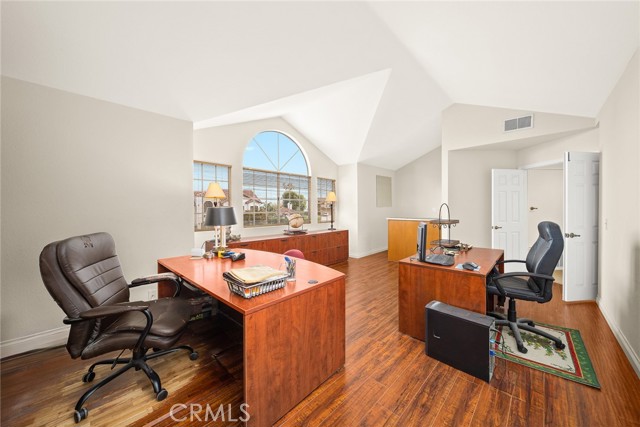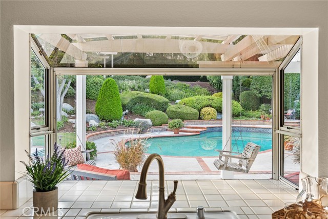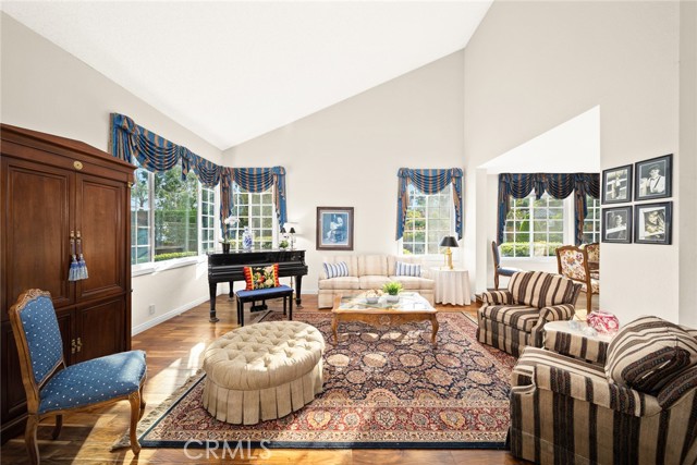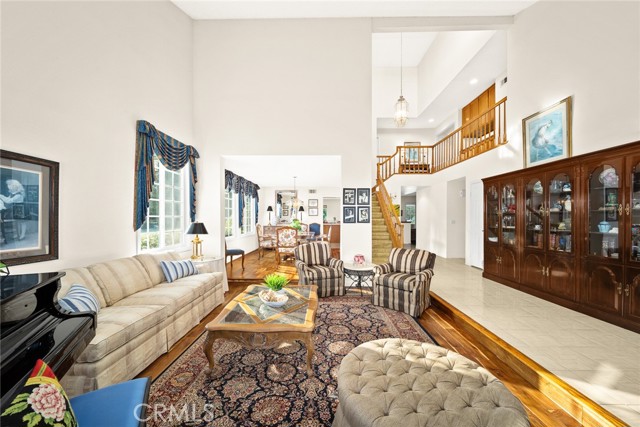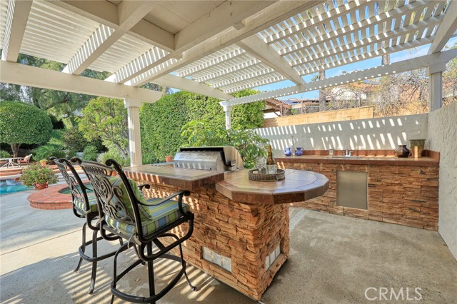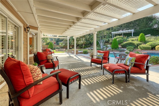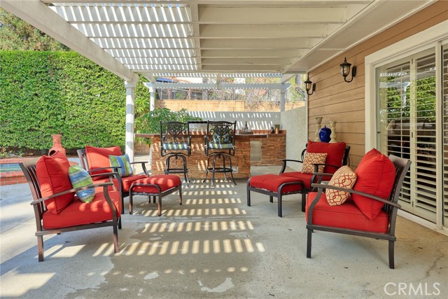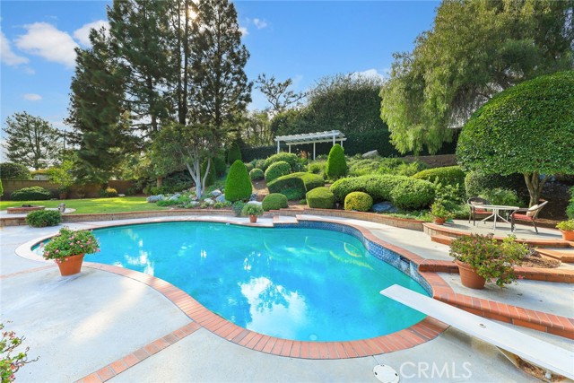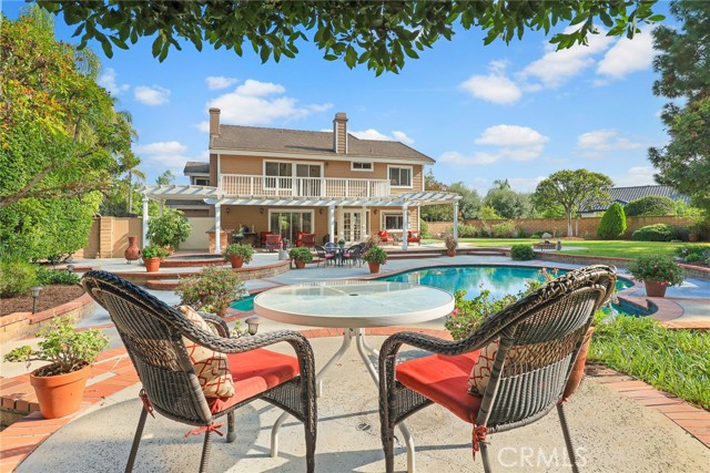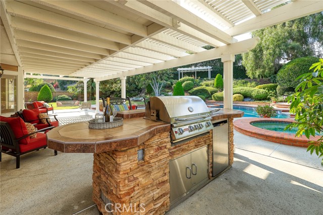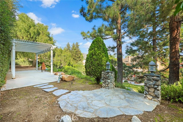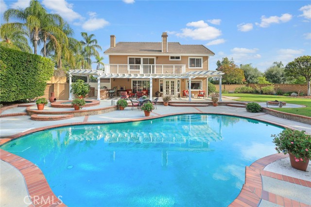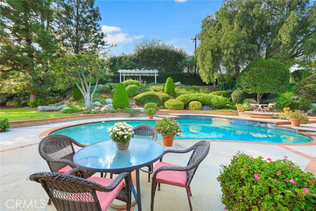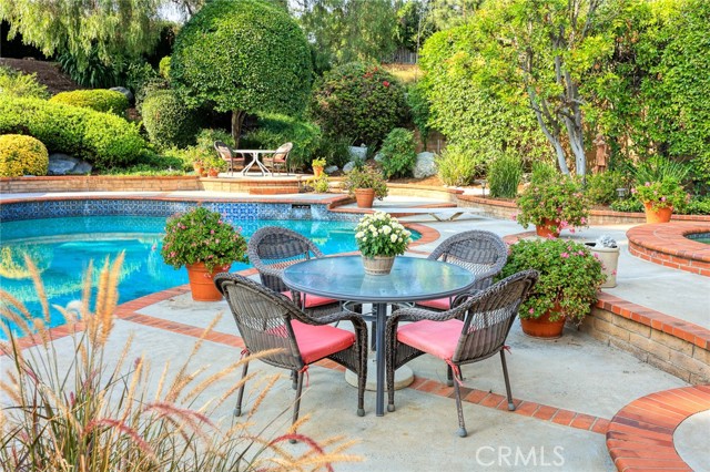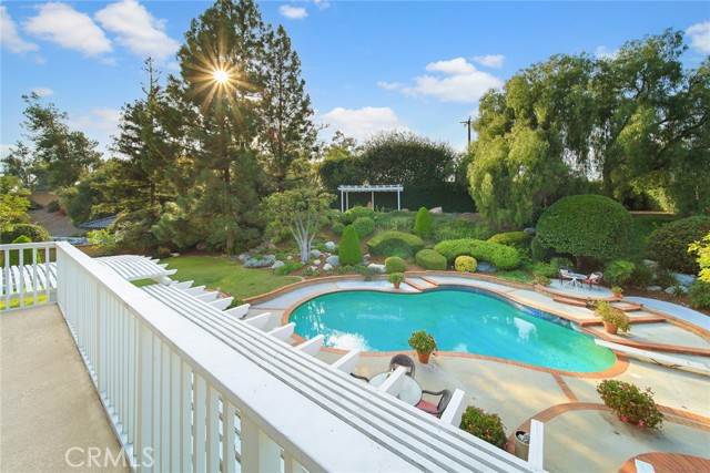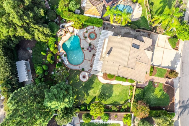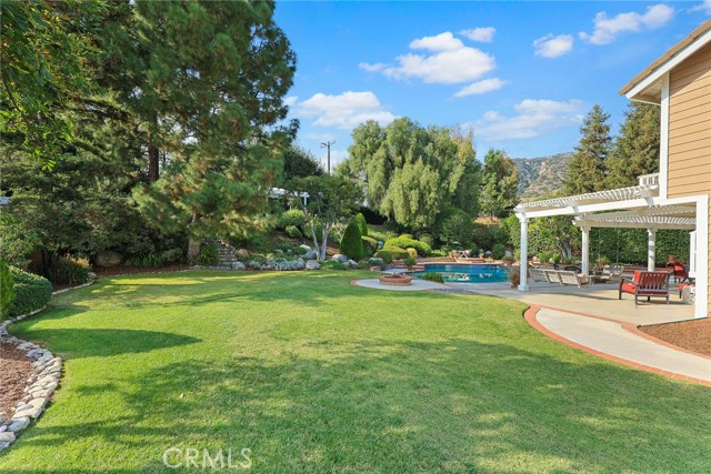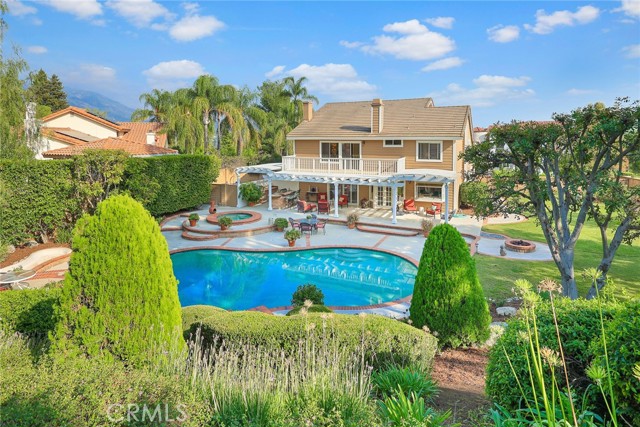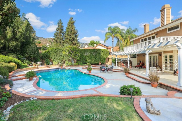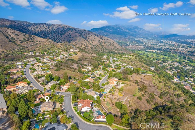 Are you looking for a property with exceptional outdoor areas to hold the grandest of garden parties? Located on a private cul de sac lot over 2/3 acre near San Dimas Canyon golf course, this spectacular property will have you ready for holiday entertaining in style. The floor plan offers four bedrooms and four baths plus a bonus room or optional 5th bedroom. A spacious downstairs suite has a private ¾ bath with separate outside access.rnEnter the formal living and dining rooms with vaulted ceilings and gorgeous acacia wood flooring. The cheery kitchen features a center island with stainless 5 burner cooktop, double convection oven, soffit ceiling with recessed and rope lighting, walk in pantry, and garden window with views to the back yard. A large breakfast nook with tiled flooring opens to the spacious family room appointed with plantation shutters, built in bar cabinet, and a fireplace with custom carved wood and marble surround. Sliding patio doors open to your outdoor oasis.rnThe 1st floor has a large suite with its own ¾ bath and private entrance perfect for extended family or guests, along with an additional ¾ bath. 2nd floor has two additional bedrooms serviced by a full hall bath, and a versatile bonus room with laminate wood flooring and room for dual home offices. A luxury primary suite offers a romantic bricked fireplace, walk in closet, and spacious bath with oval soaking tub, walk in shower and dual sink vanity. Sliding doors open to a large private balcony overlooking the gorgeous grounds. rnEye popping back yard paradise boasts an expansive lattice covered wood patio, custom built BBQ island with extra burner and refrigerator, along with an additional stacked stone work station and sink. The sparkling pool and large in-ground spa are the centerpiece of the tranquil setting with multiple patio areas, firepit, and lush landscaping. A flagstone staircase takes you to a private pergola retreat with foothill views.rnThere is a three-car garage and gated access for potential RV parking. This outstanding property is close to San Dimas Canyon Golf Course with its scenic foothill fairways, San Dimas Canyon Park, Sycamore Canyon Equestrian Center, and hiking trails. A rare find!